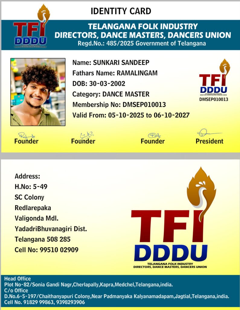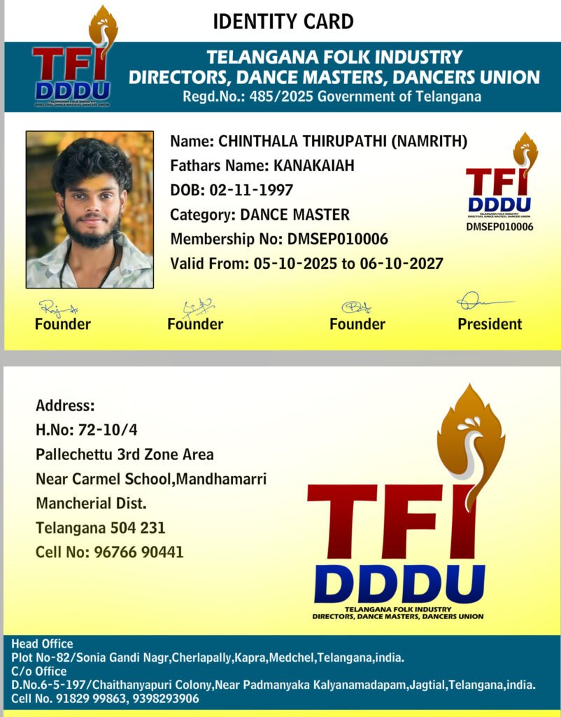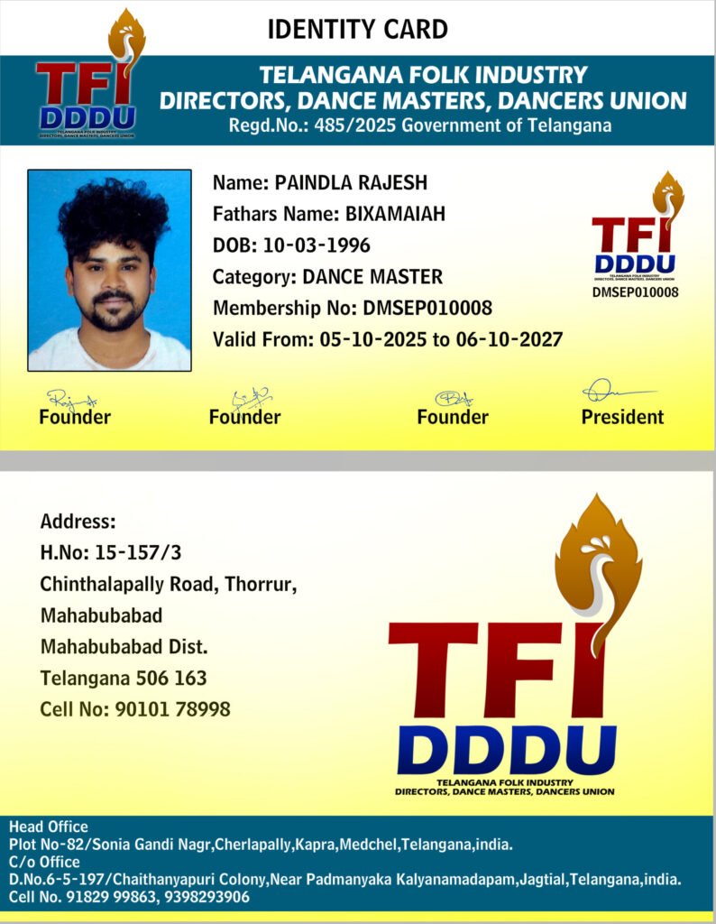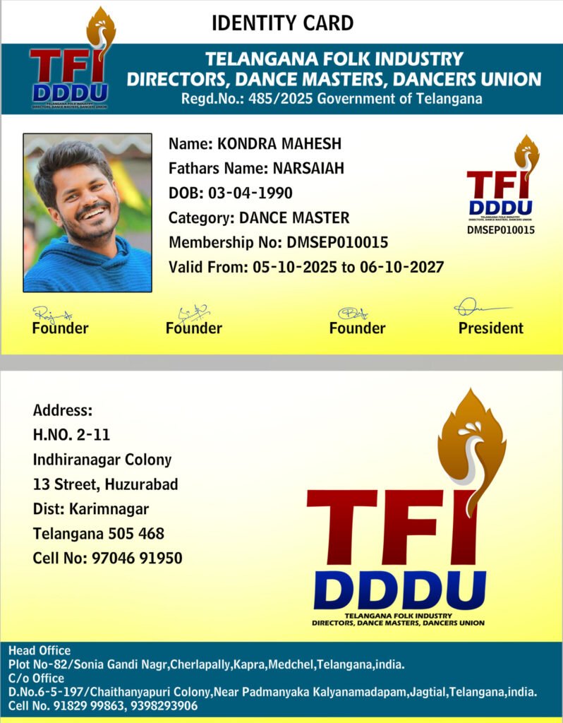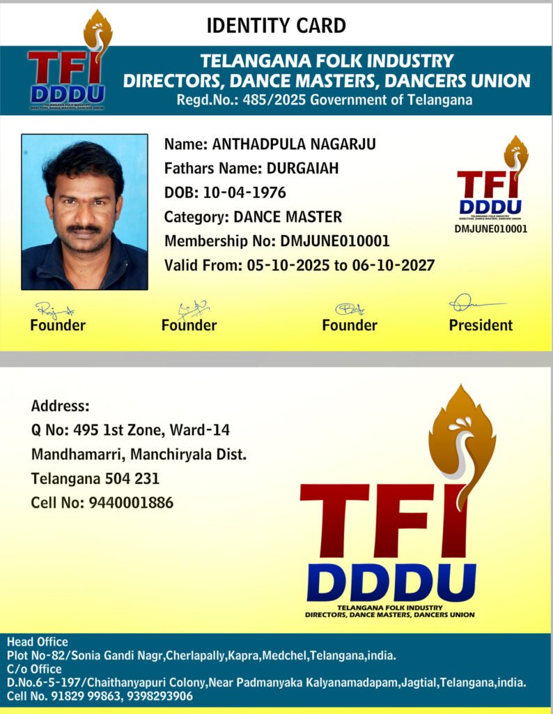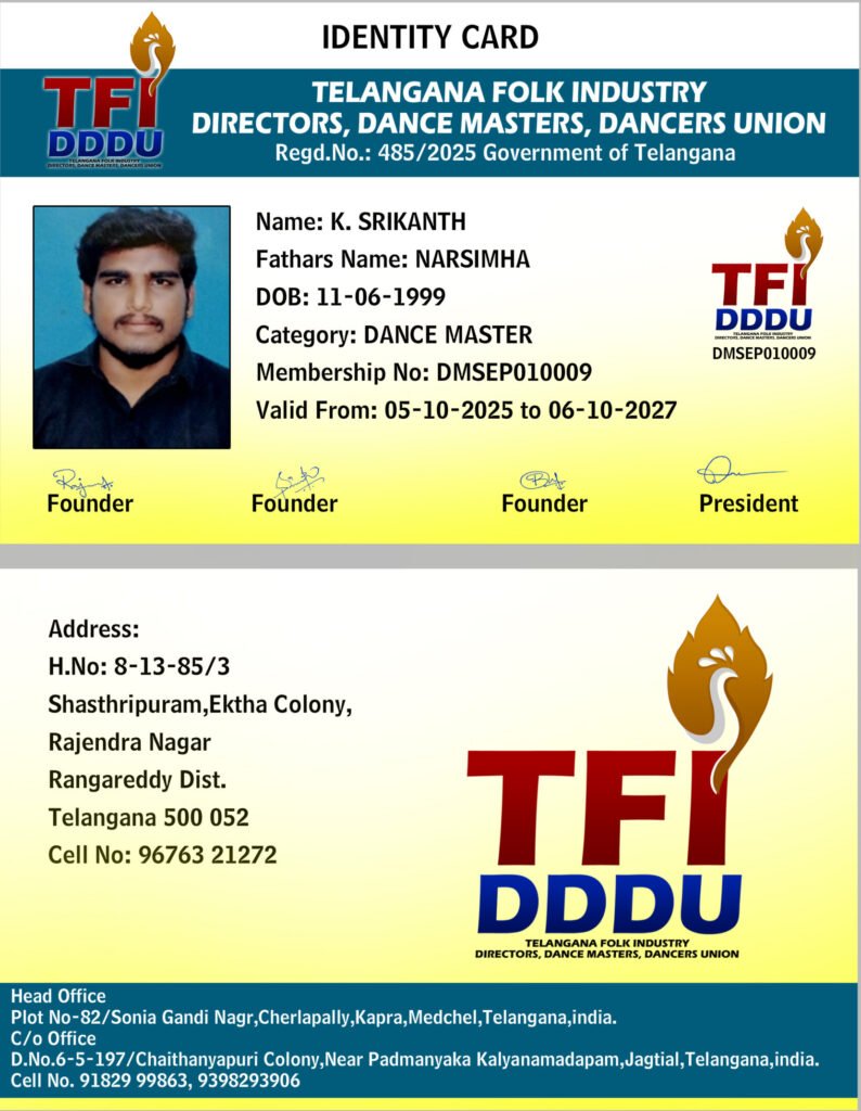 "Telangana Folk Industry Directors Dance masters Dancers Union" refers to an organization (union or association) that represents and supports professionals involved in the folk dance and film industry in the Indian state of Telangana.
