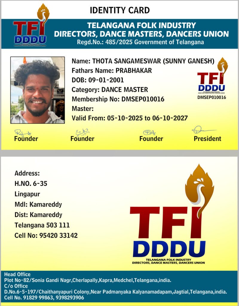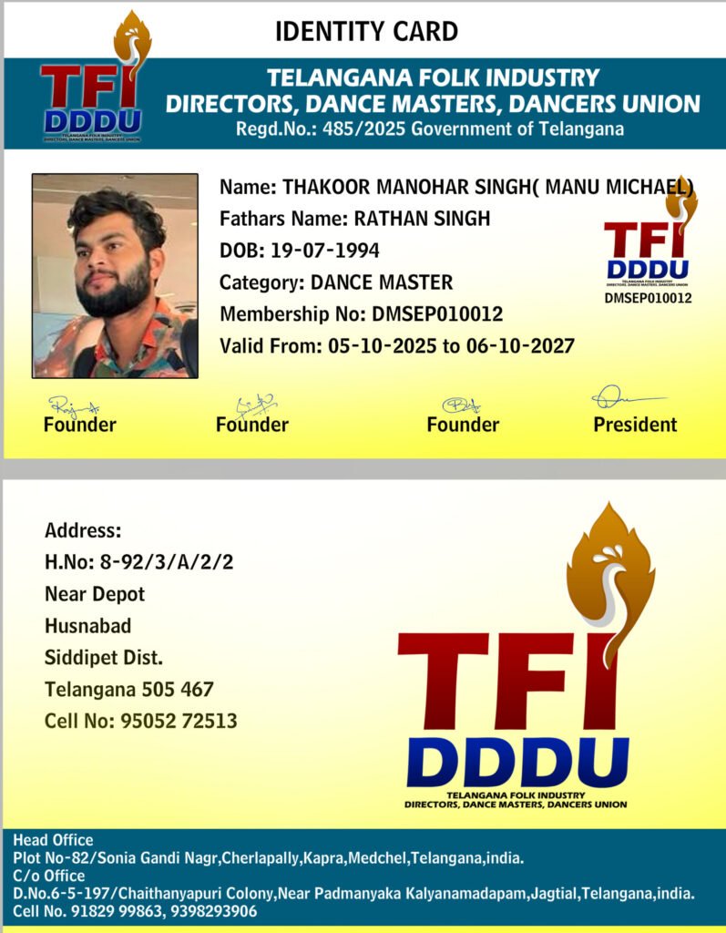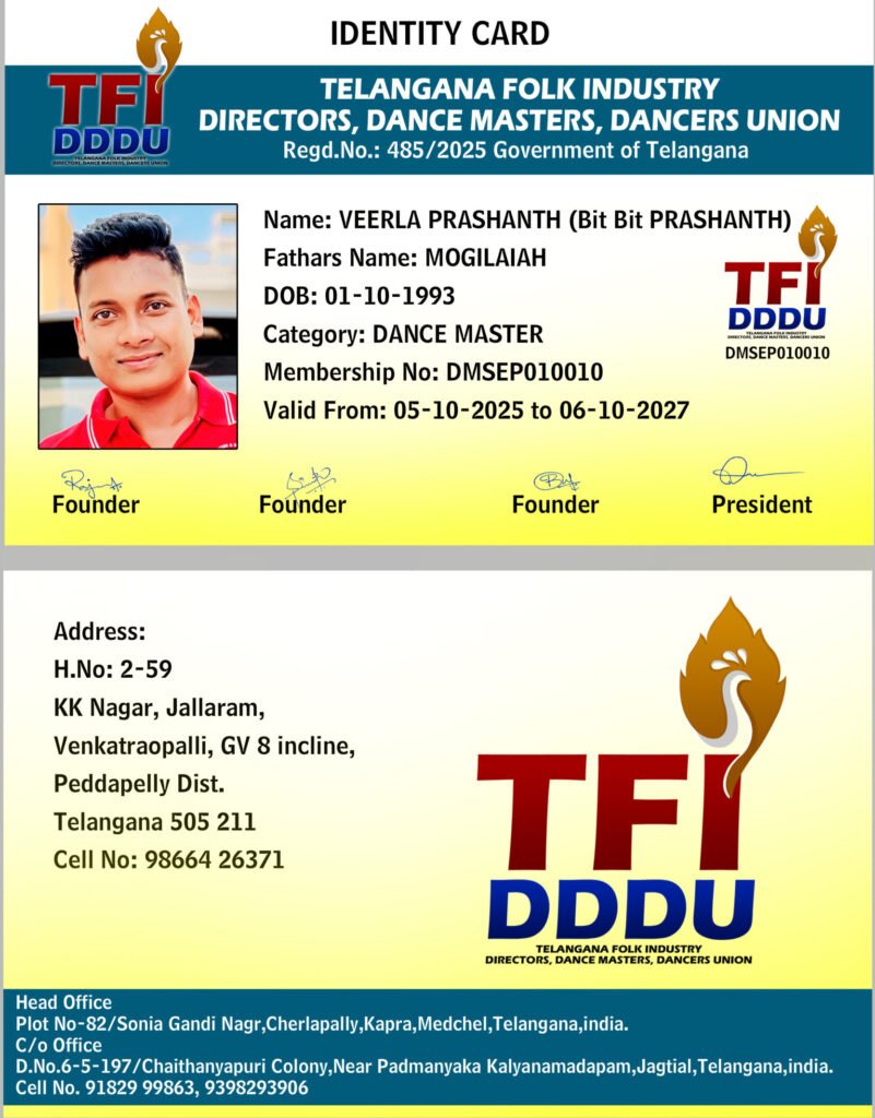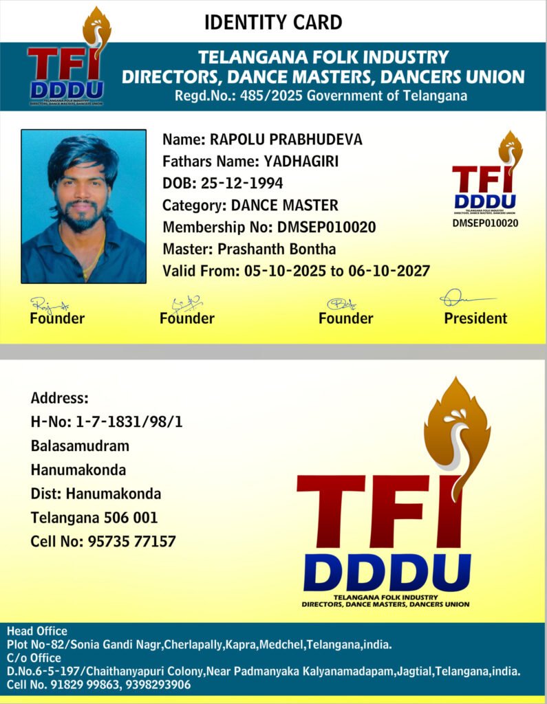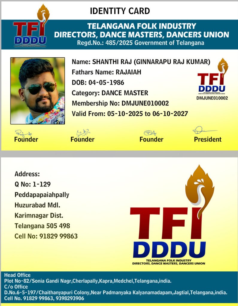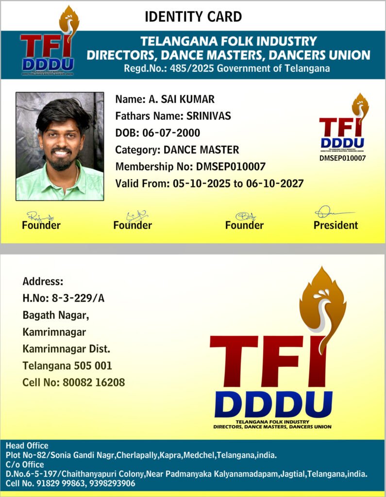 "Telangana Folk Industry Directors Dance masters Dancers Union" refers to an organization (union or association) that represents and supports professionals involved in the folk dance and film industry in the Indian state of Telangana.