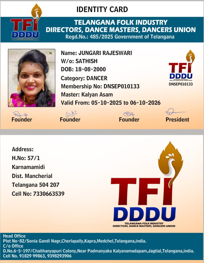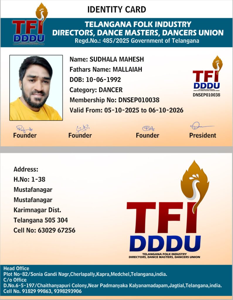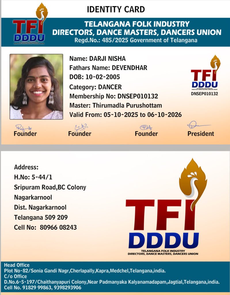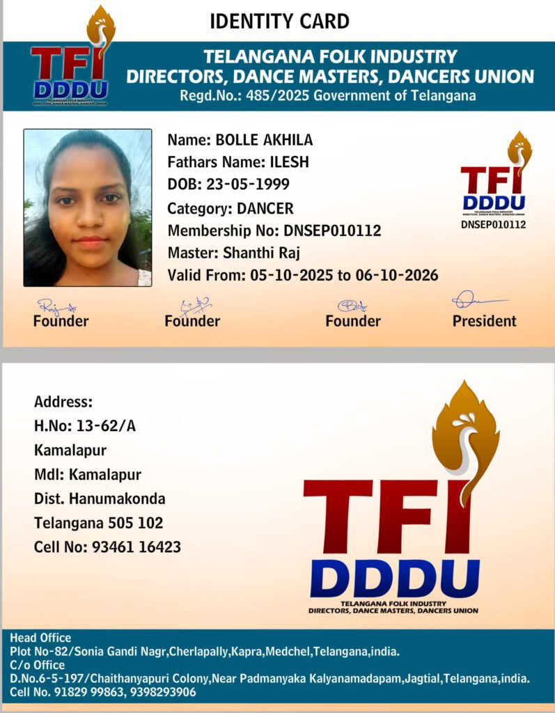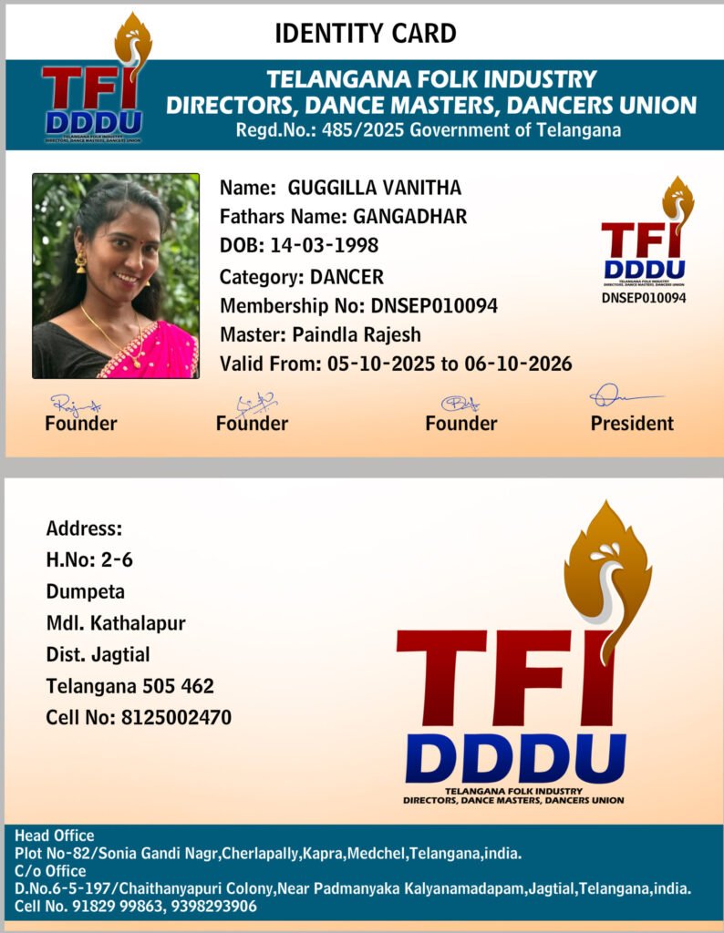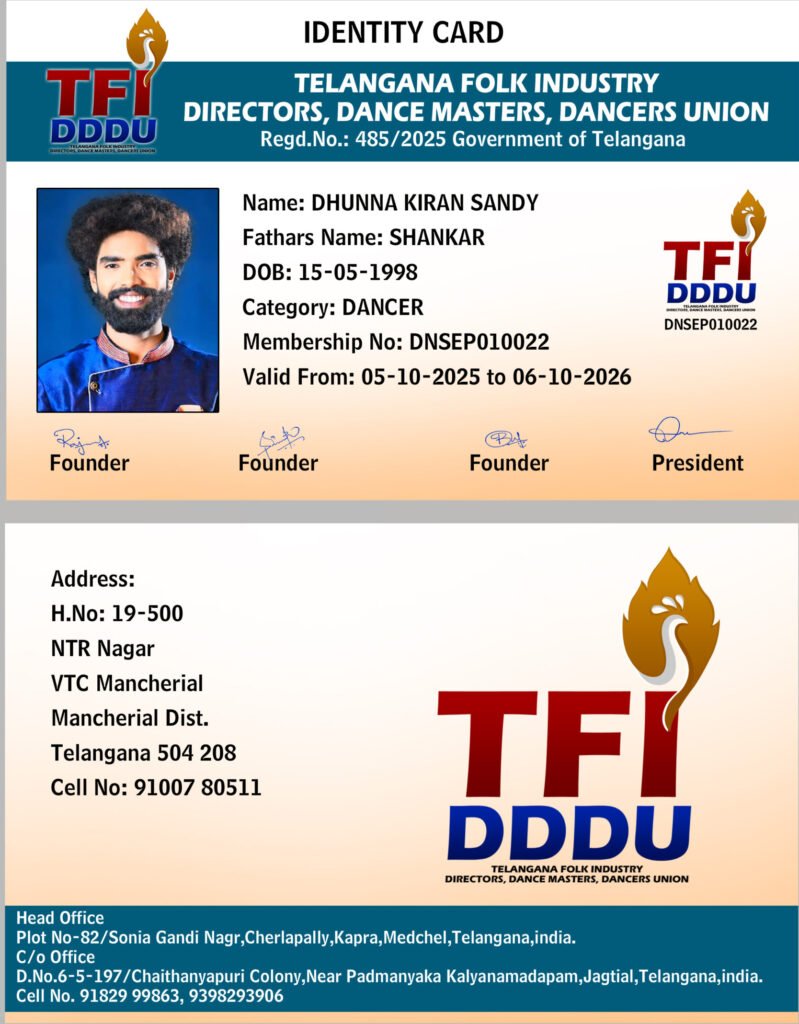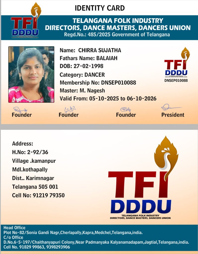 "Telangana Folk Industry Directors Dance masters Dancers Union" refers to an organization (union or association) that represents and supports professionals involved in the folk dance and film industry in the Indian state of Telangana.