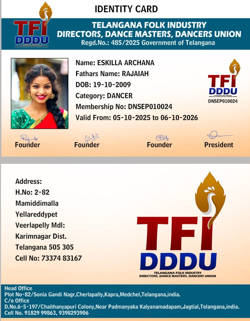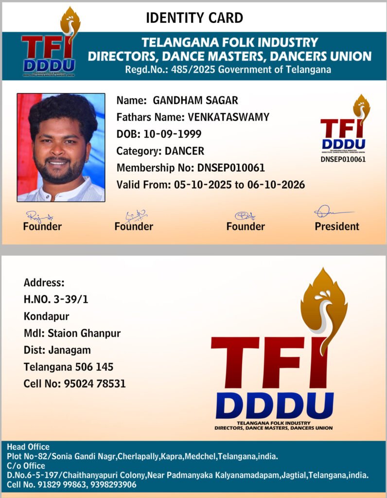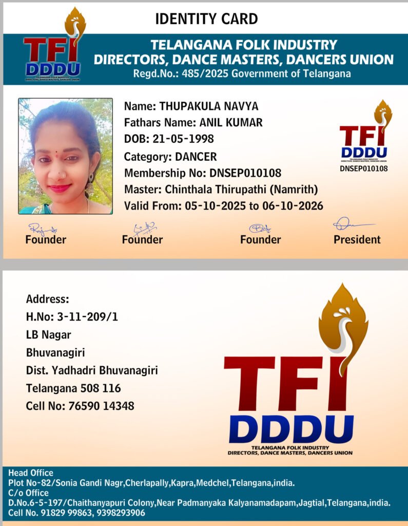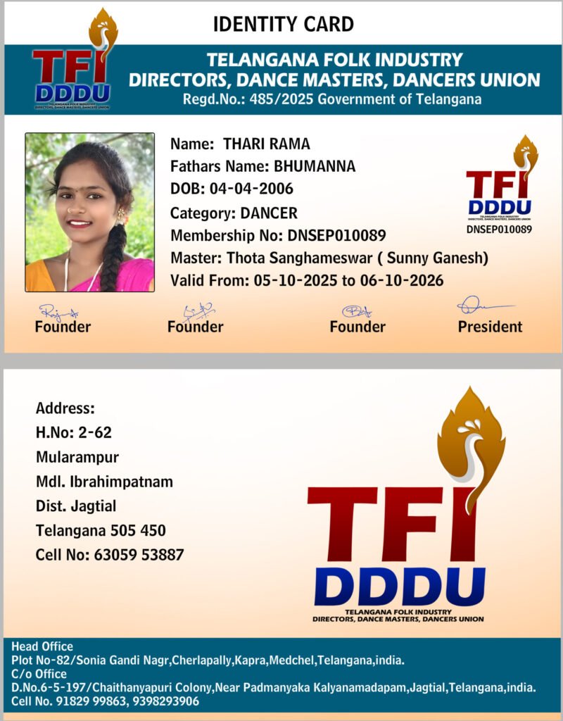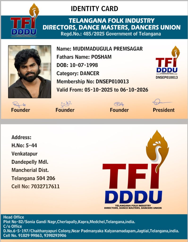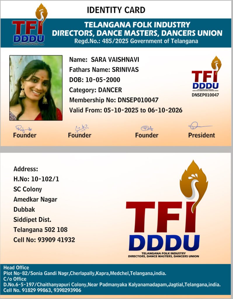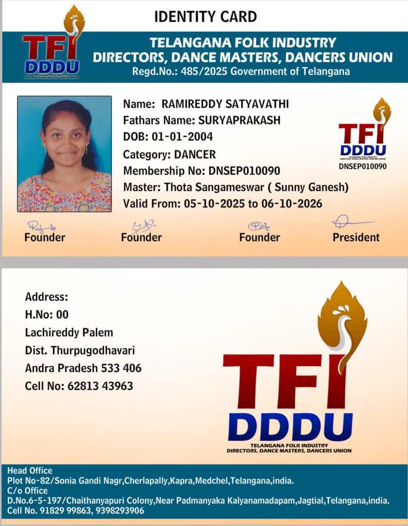 "Telangana Folk Industry Directors Dance masters Dancers Union" refers to an organization (union or association) that represents and supports professionals involved in the folk dance and film industry in the Indian state of Telangana.