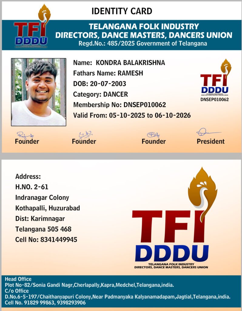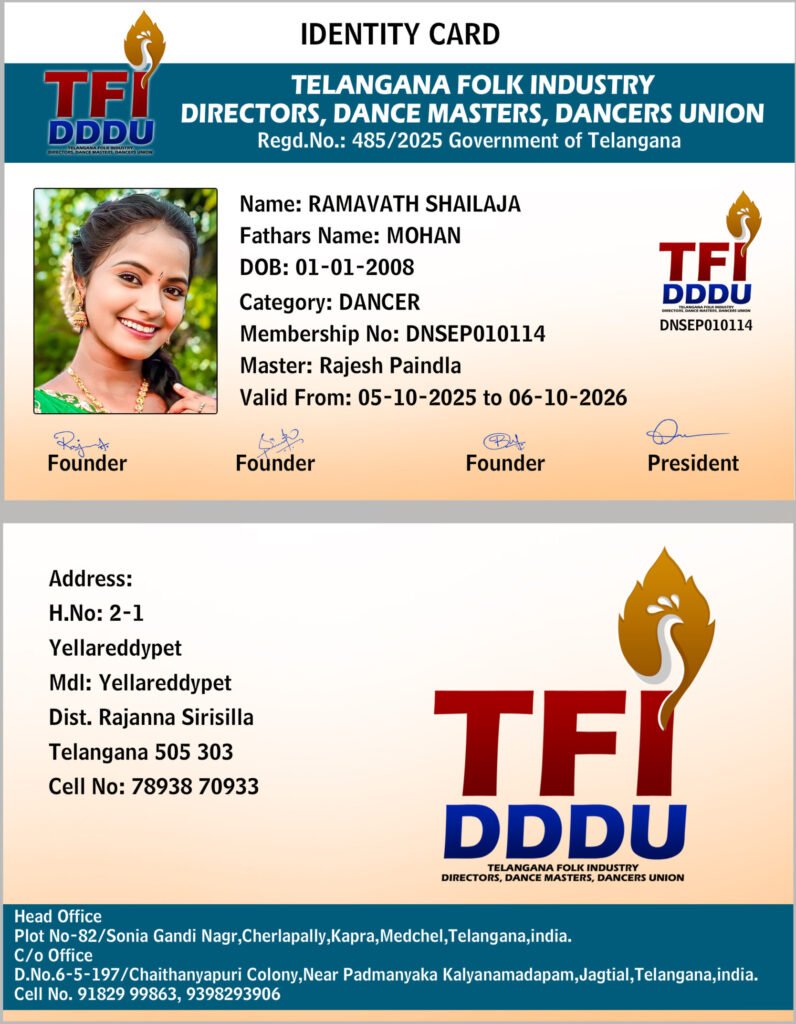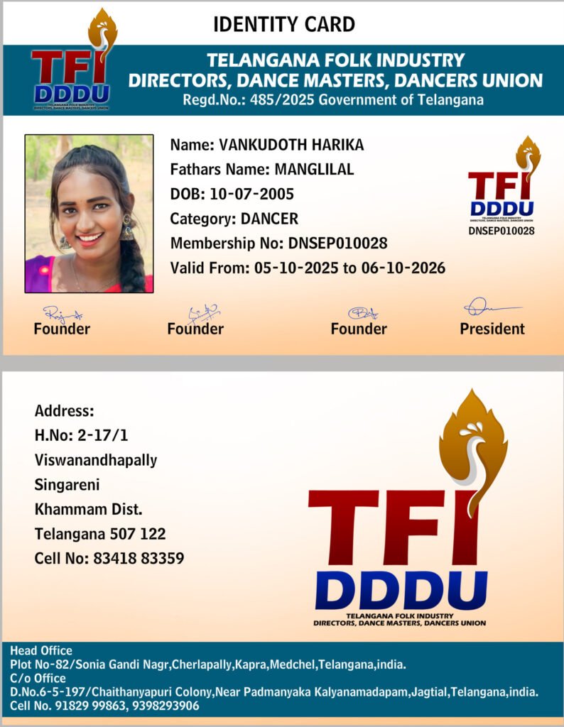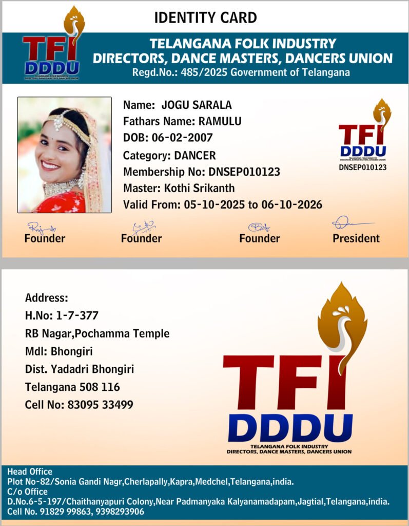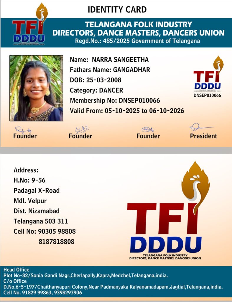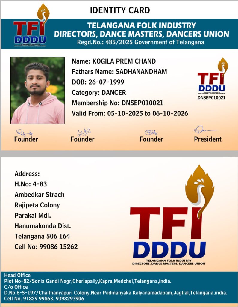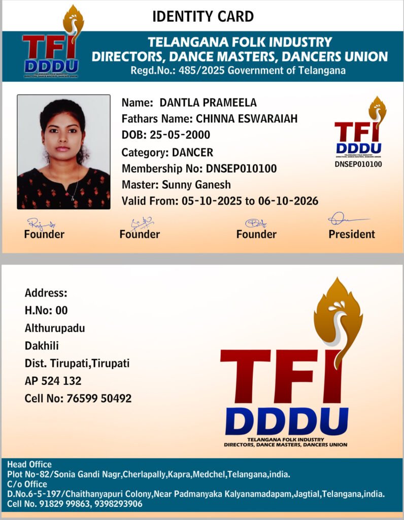"Telangana Folk Industry Directors Dance masters Dancers Union" refers to an organization (union or association) that represents and supports professionals involved in the folk dance and film industry in the Indian state of Telangana.