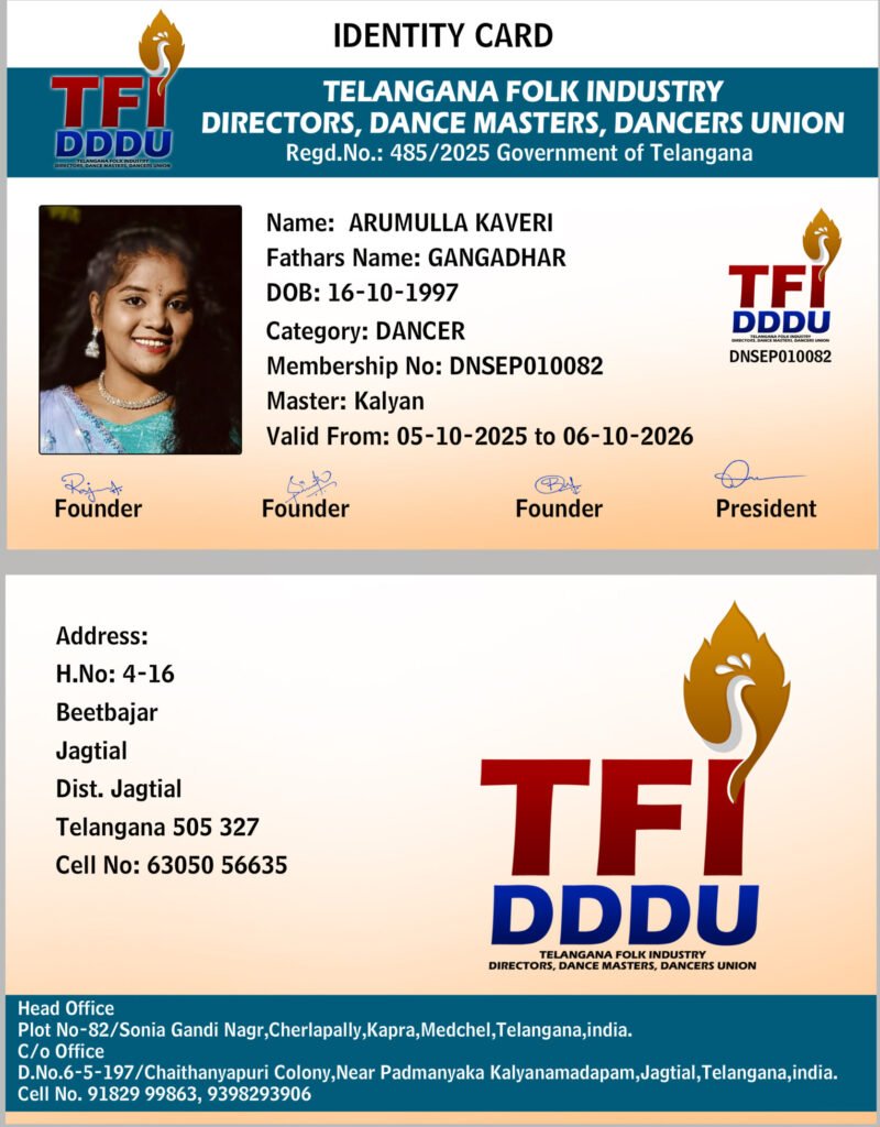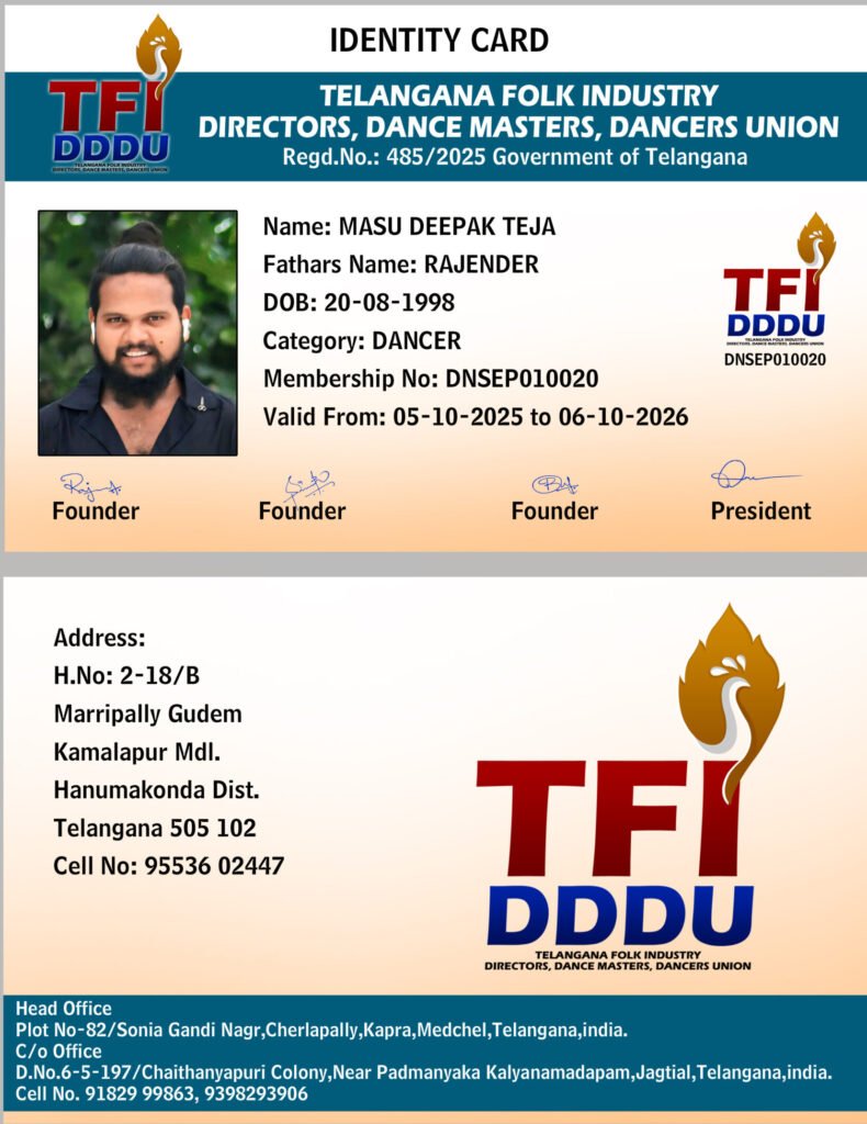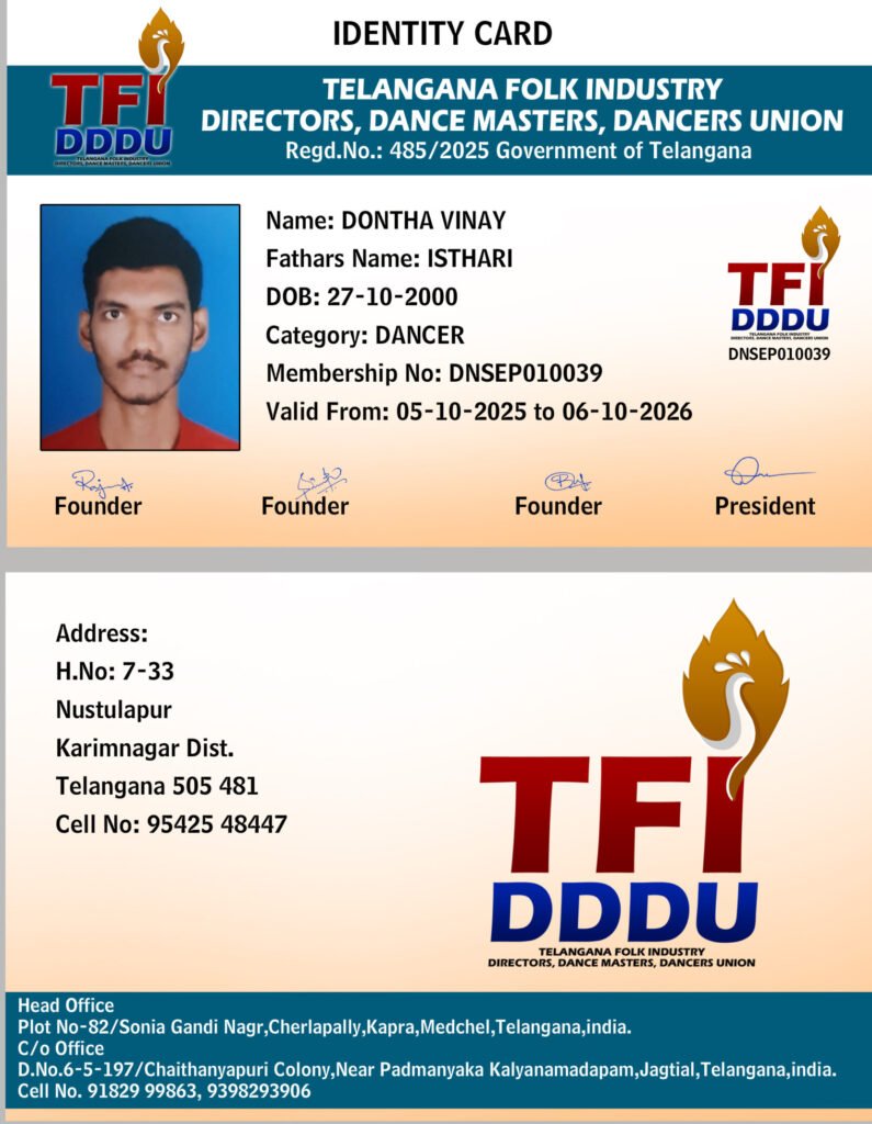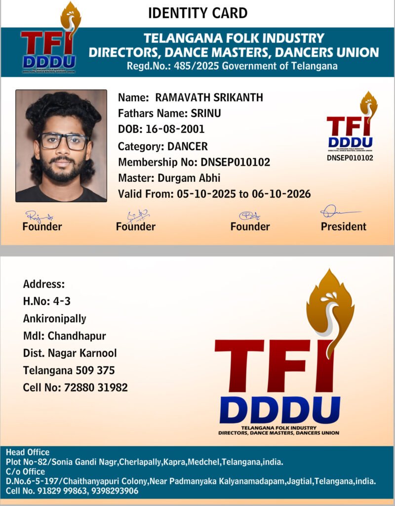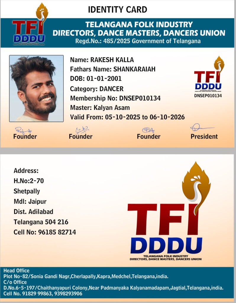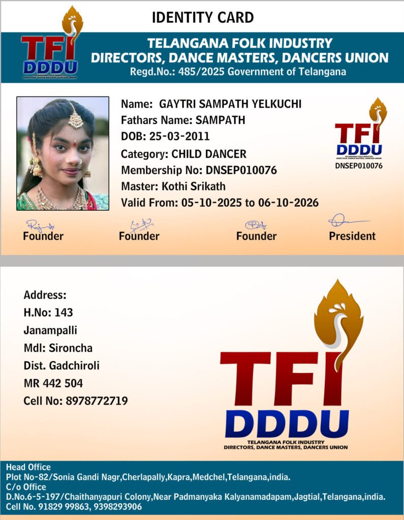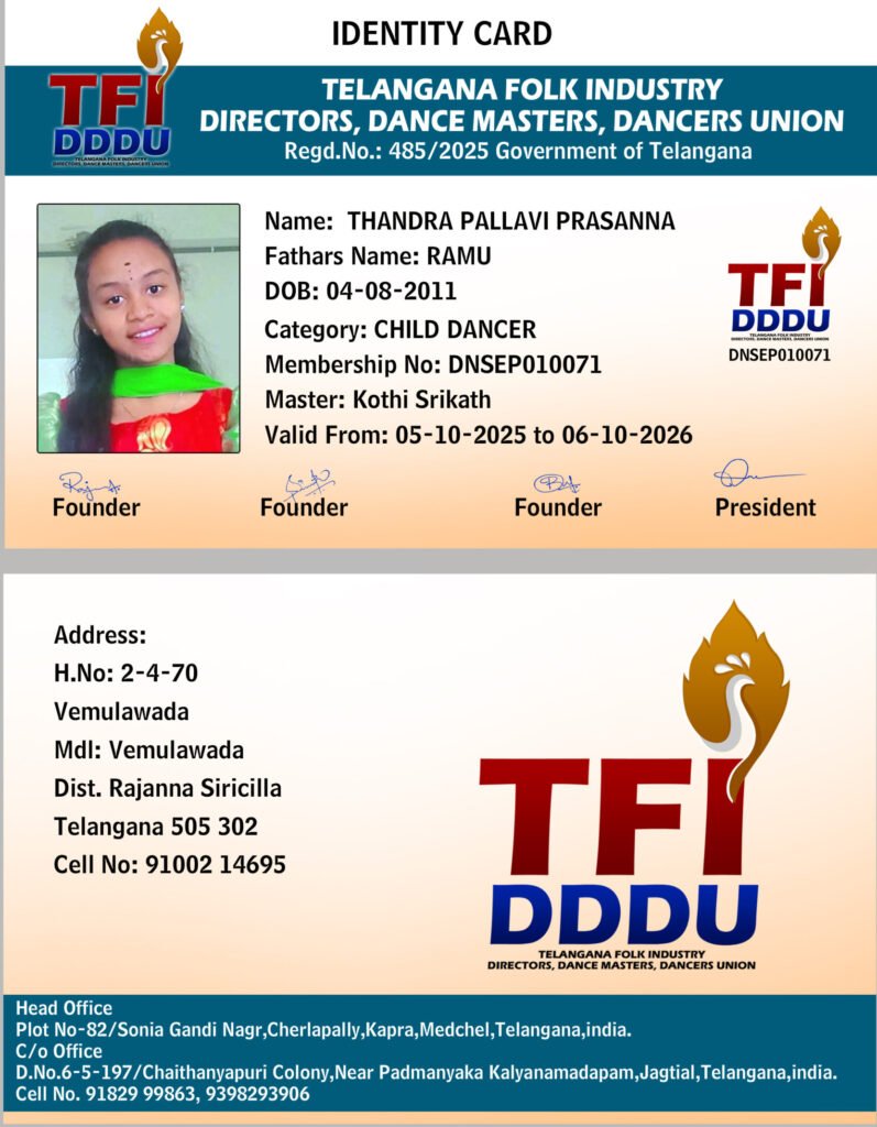 "Telangana Folk Industry Directors Dance masters Dancers Union" refers to an organization (union or association) that represents and supports professionals involved in the folk dance and film industry in the Indian state of Telangana.