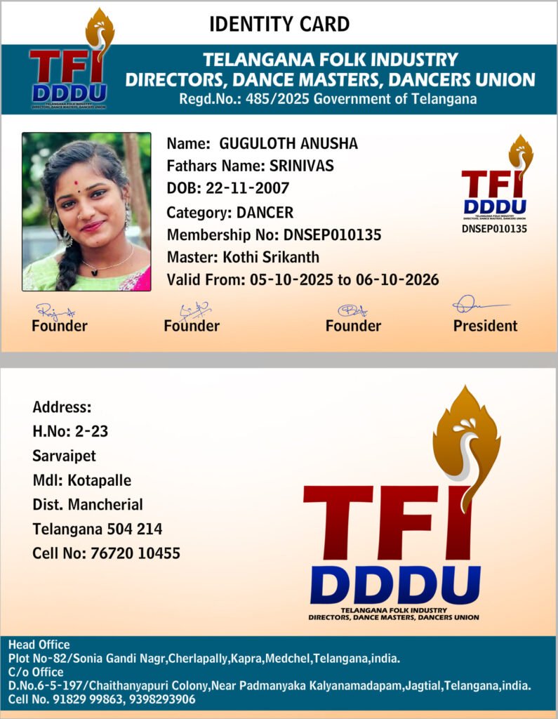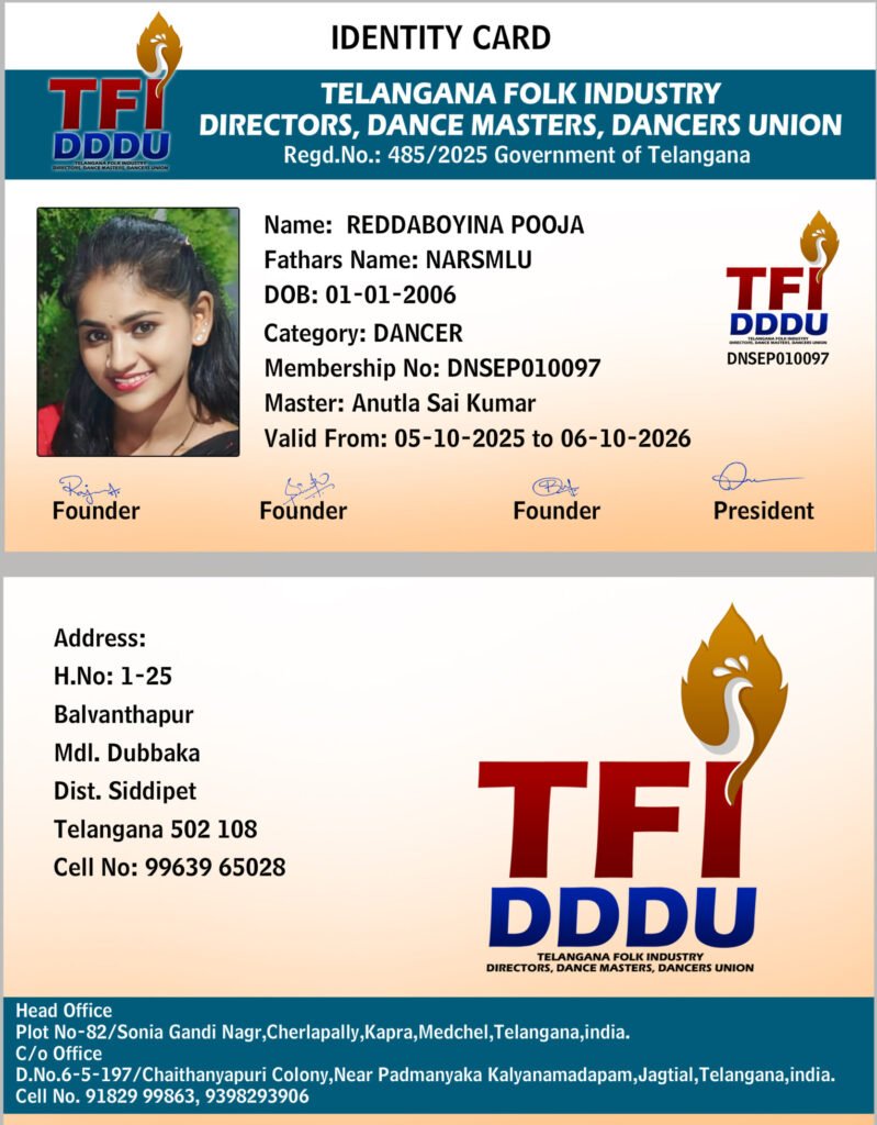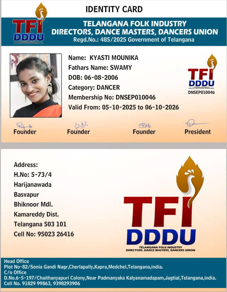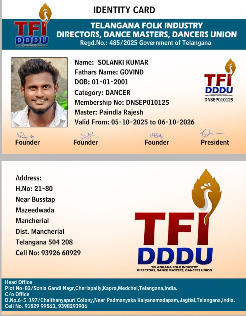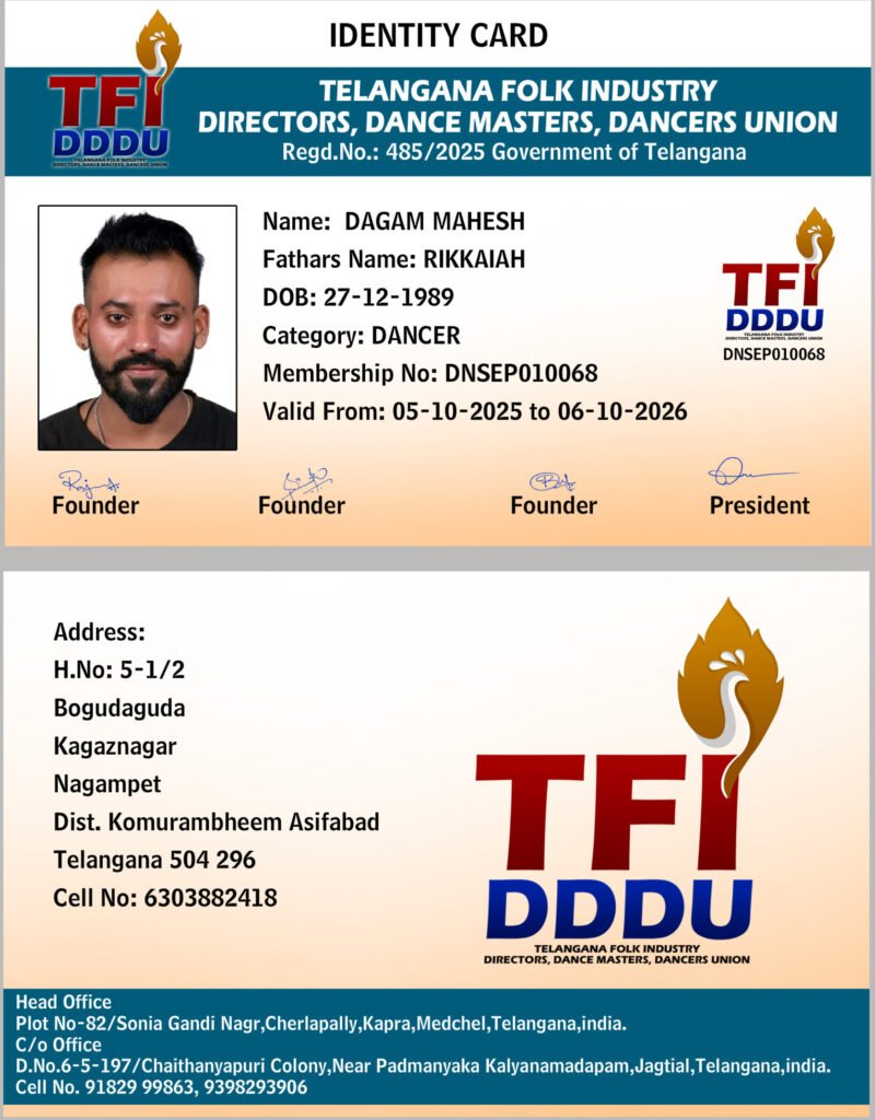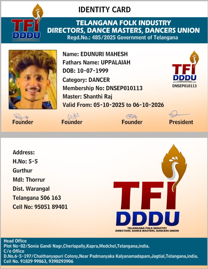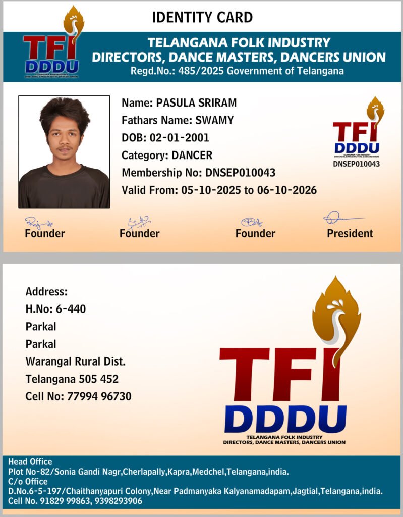 "Telangana Folk Industry Directors Dance masters Dancers Union" refers to an organization (union or association) that represents and supports professionals involved in the folk dance and film industry in the Indian state of Telangana.