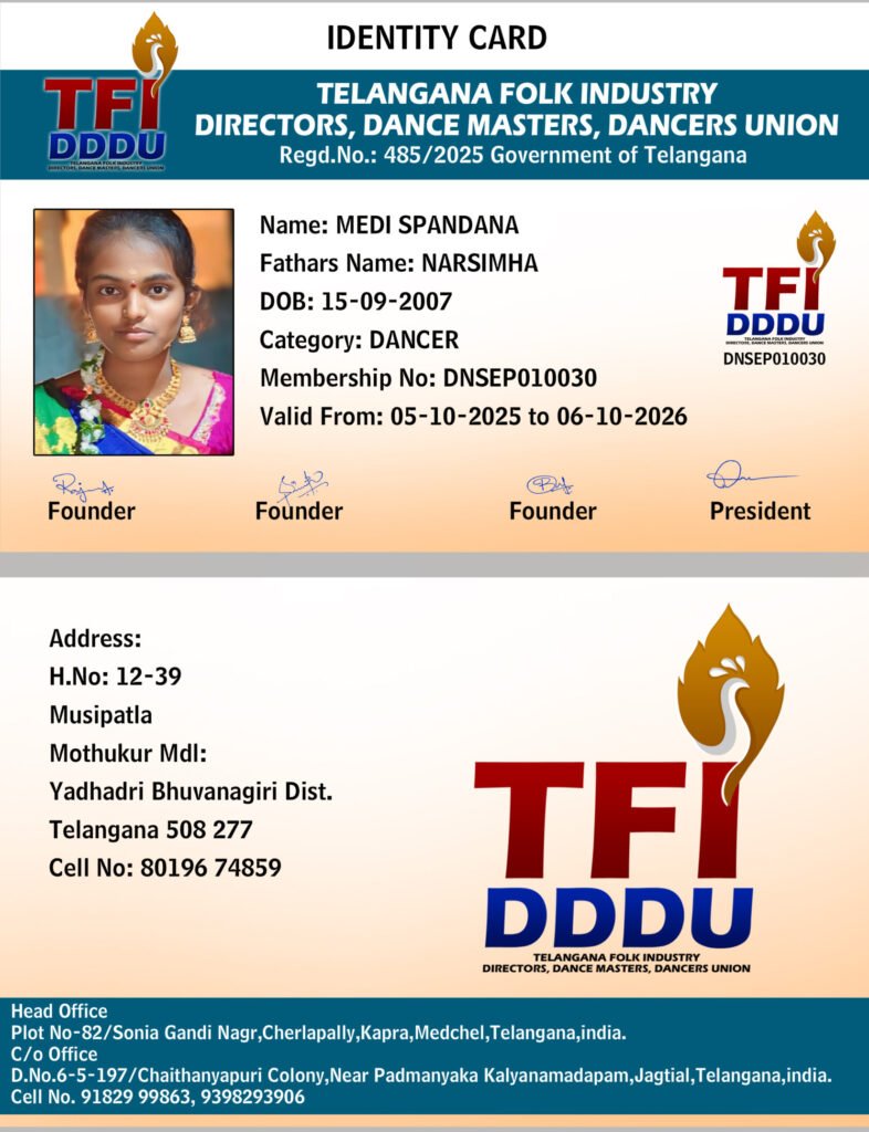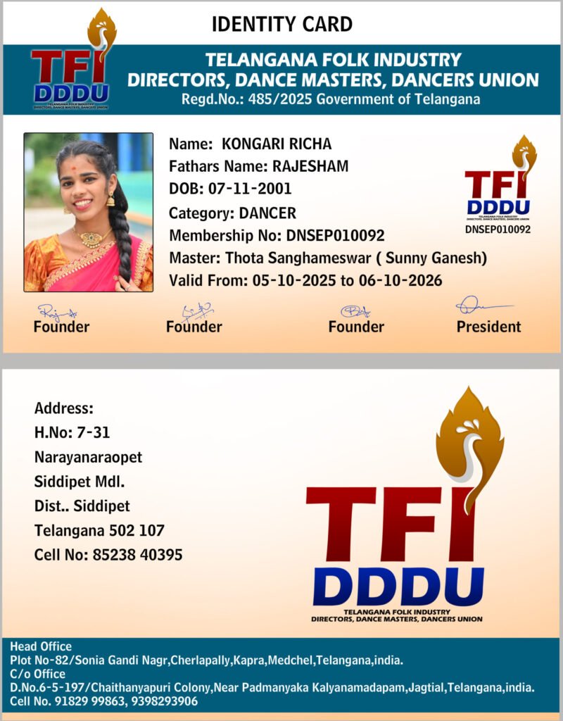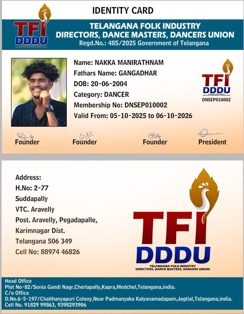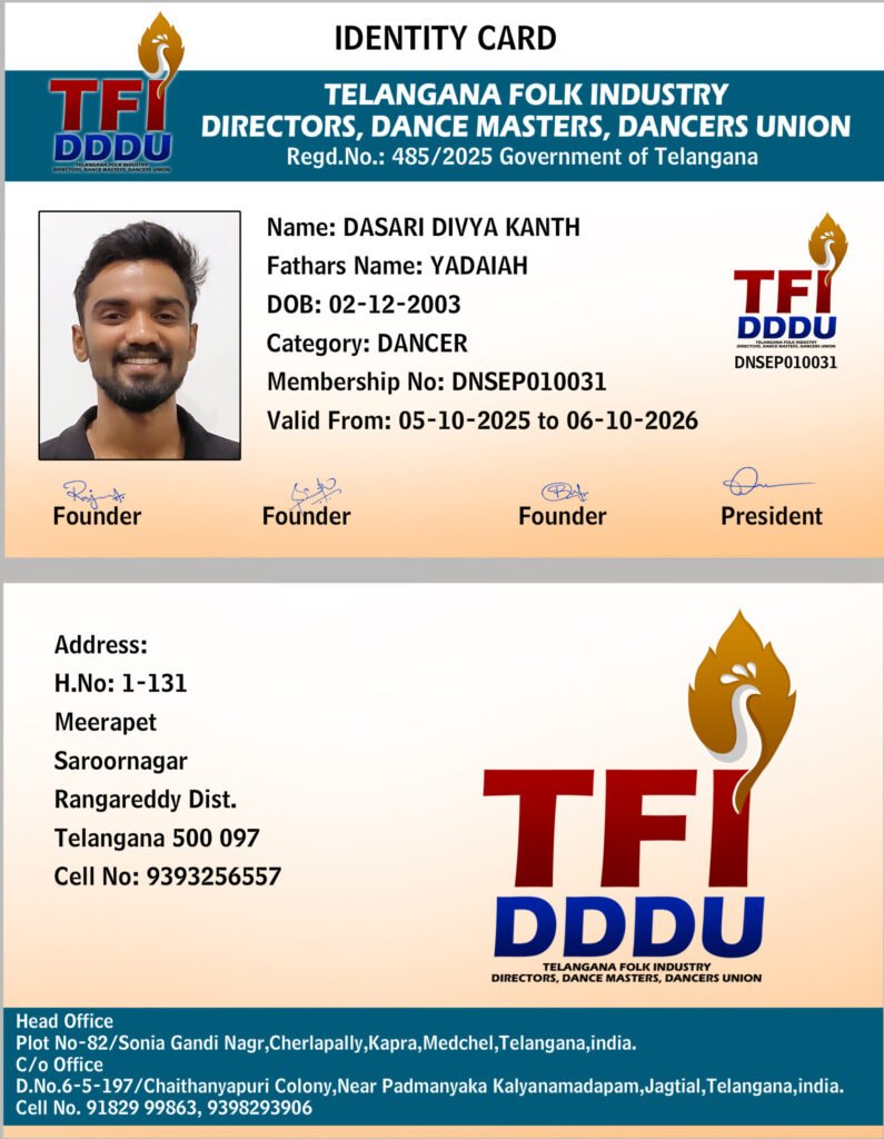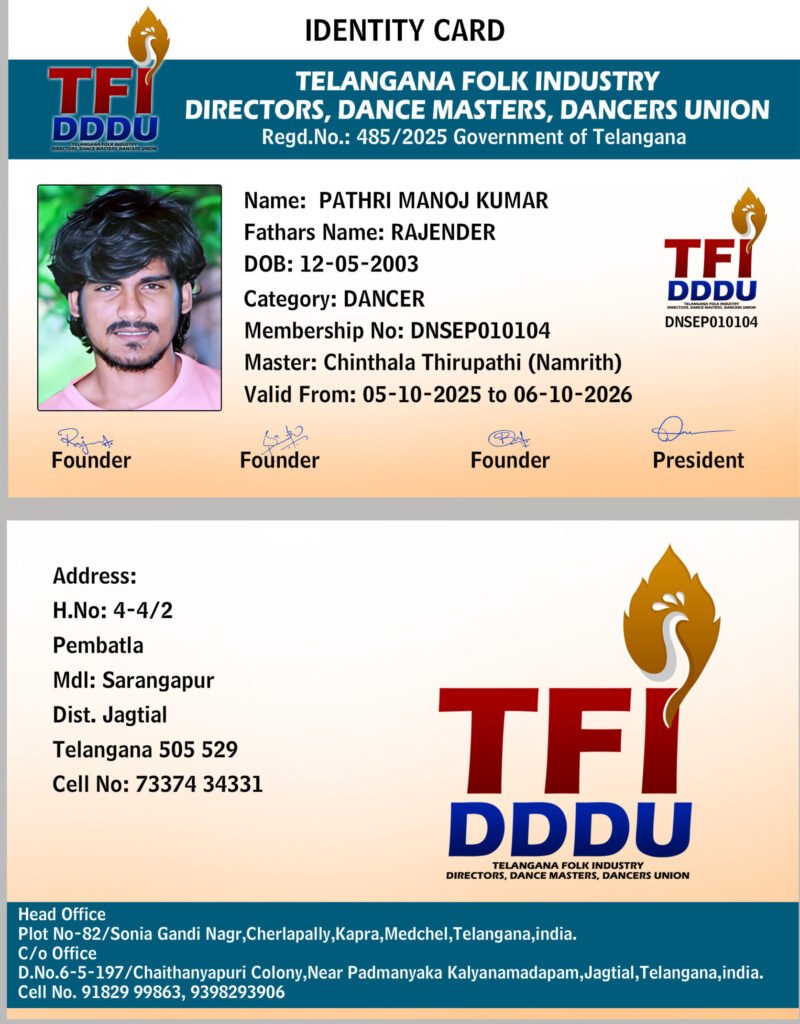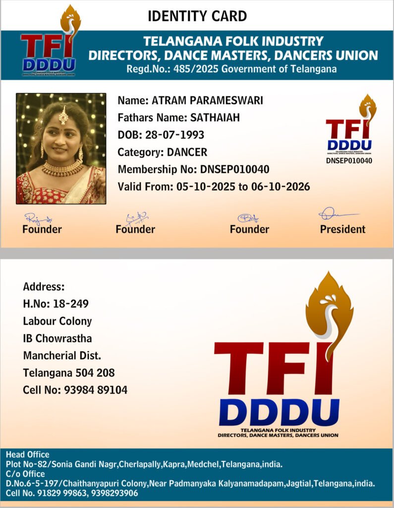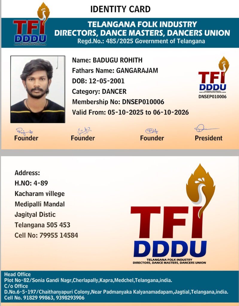 "Telangana Folk Industry Directors Dance masters Dancers Union" refers to an organization (union or association) that represents and supports professionals involved in the folk dance and film industry in the Indian state of Telangana.