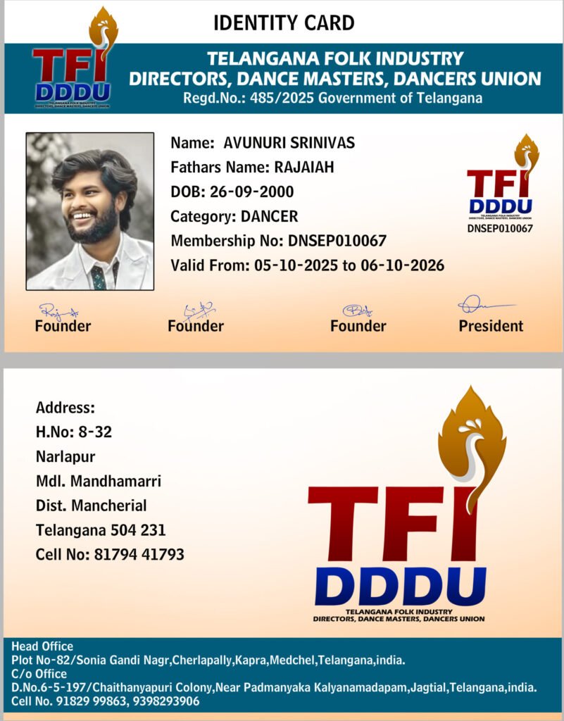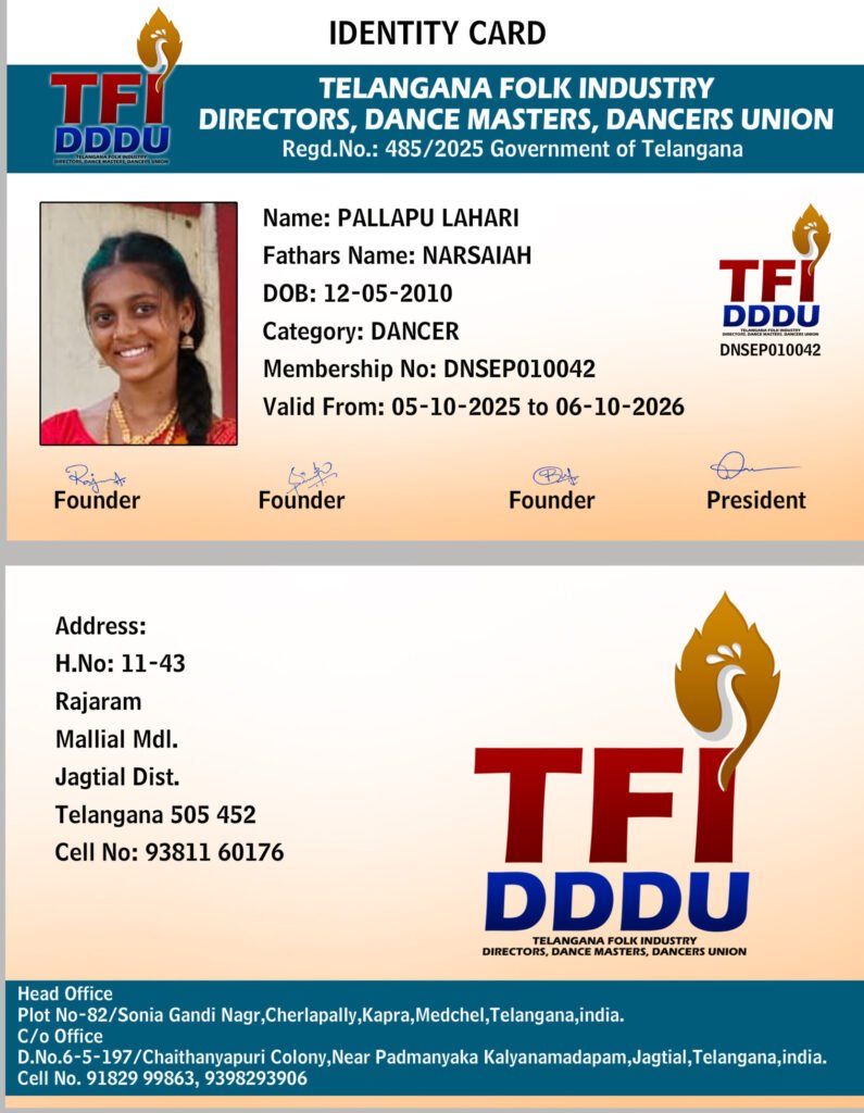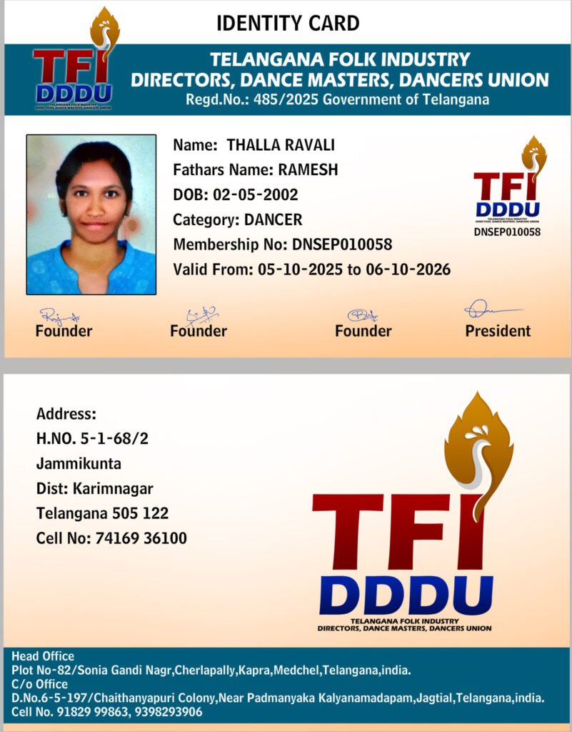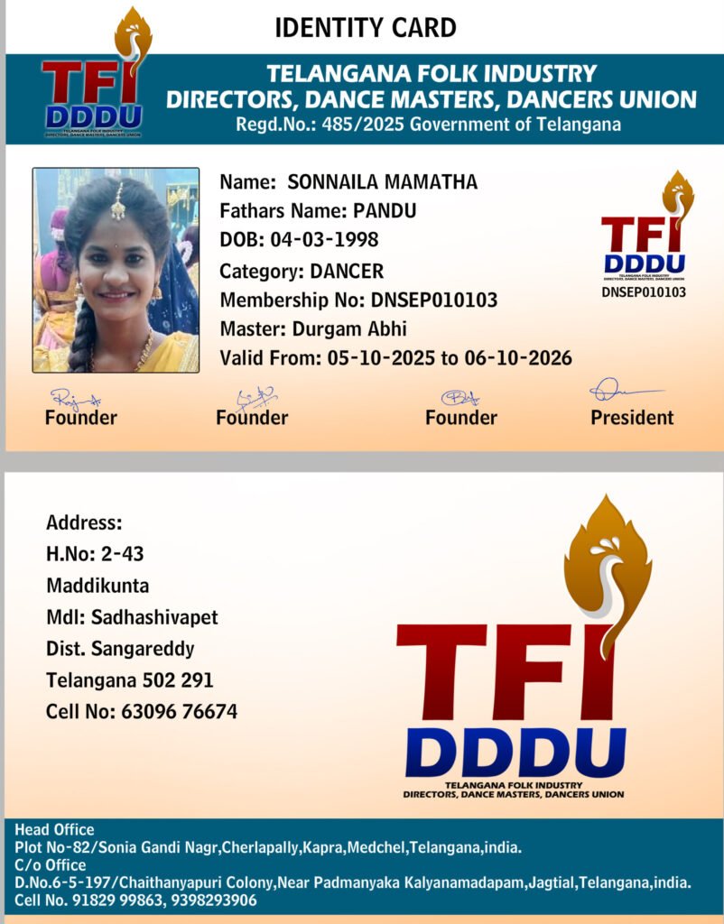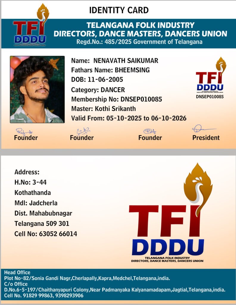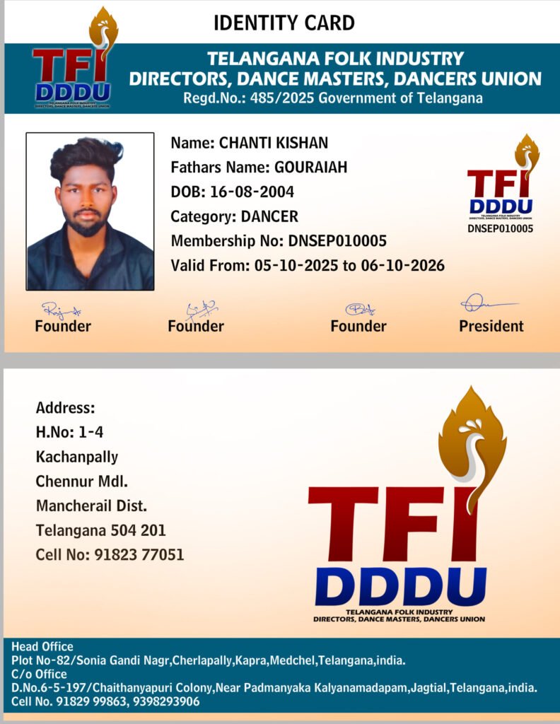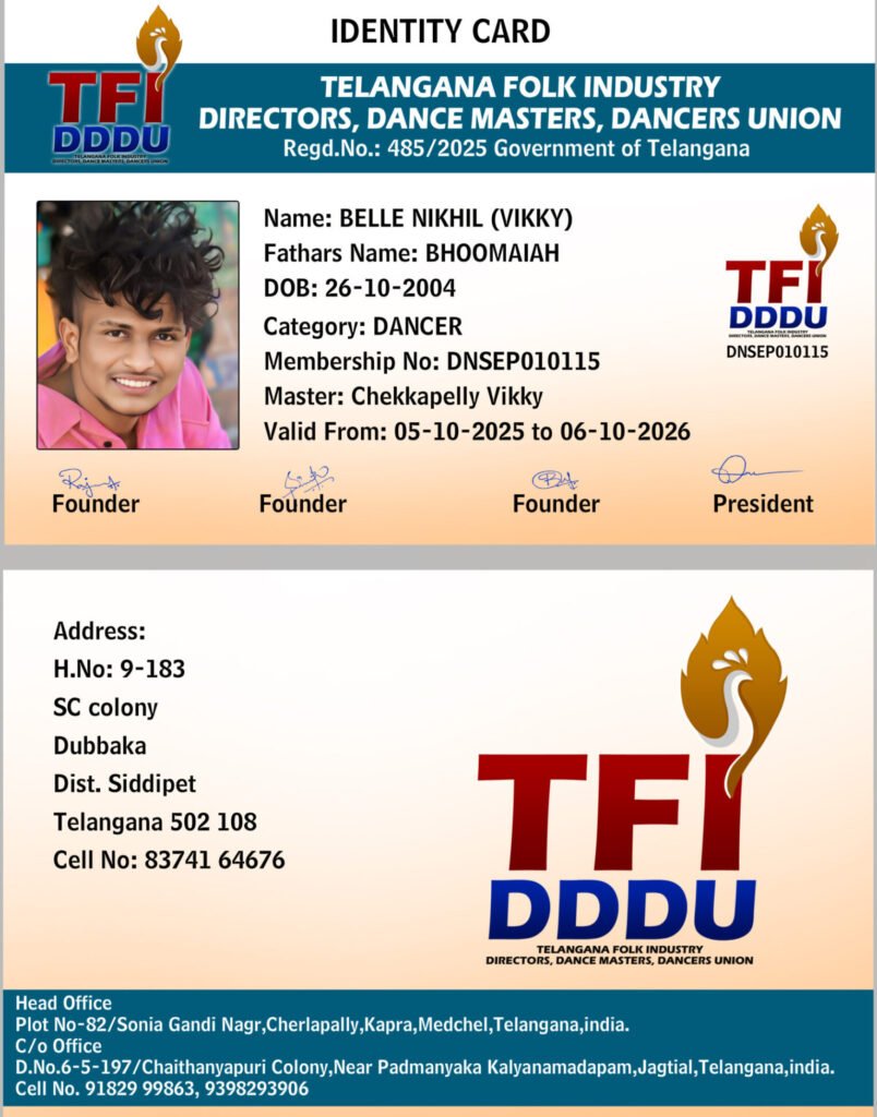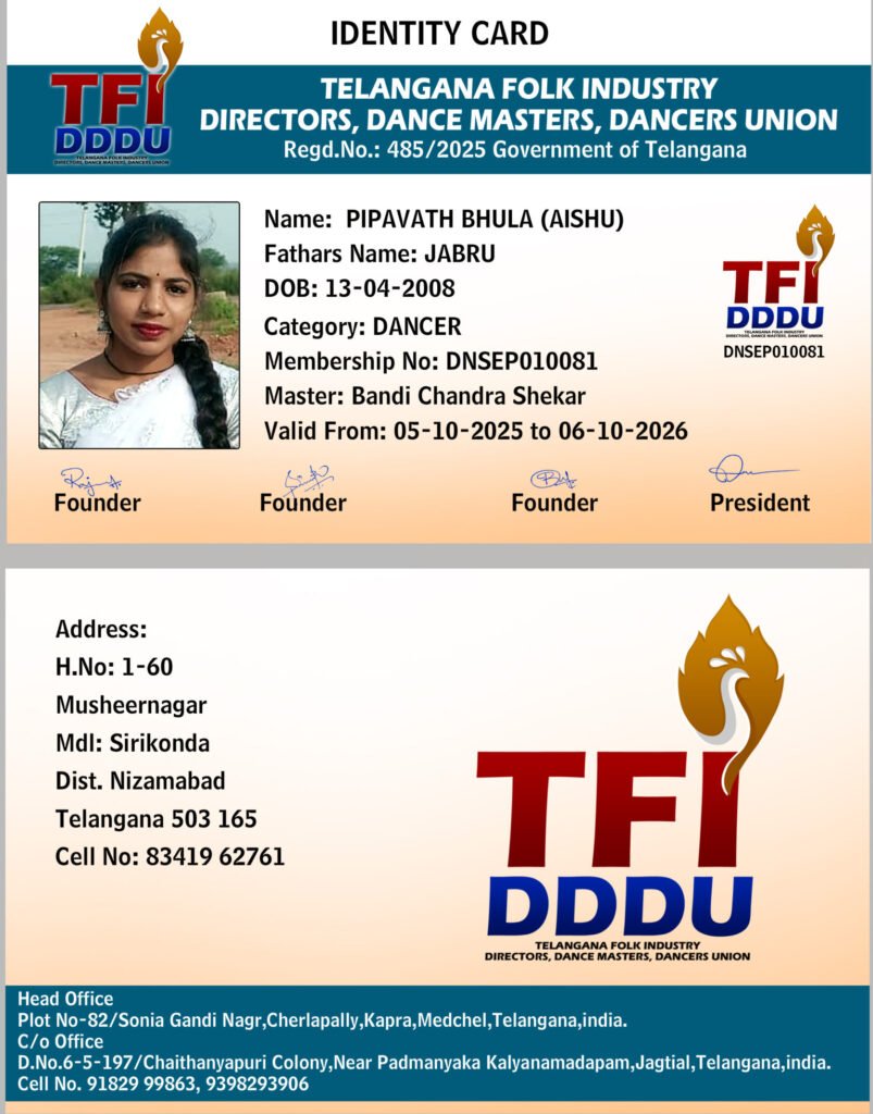 "Telangana Folk Industry Directors Dance masters Dancers Union" refers to an organization (union or association) that represents and supports professionals involved in the folk dance and film industry in the Indian state of Telangana.