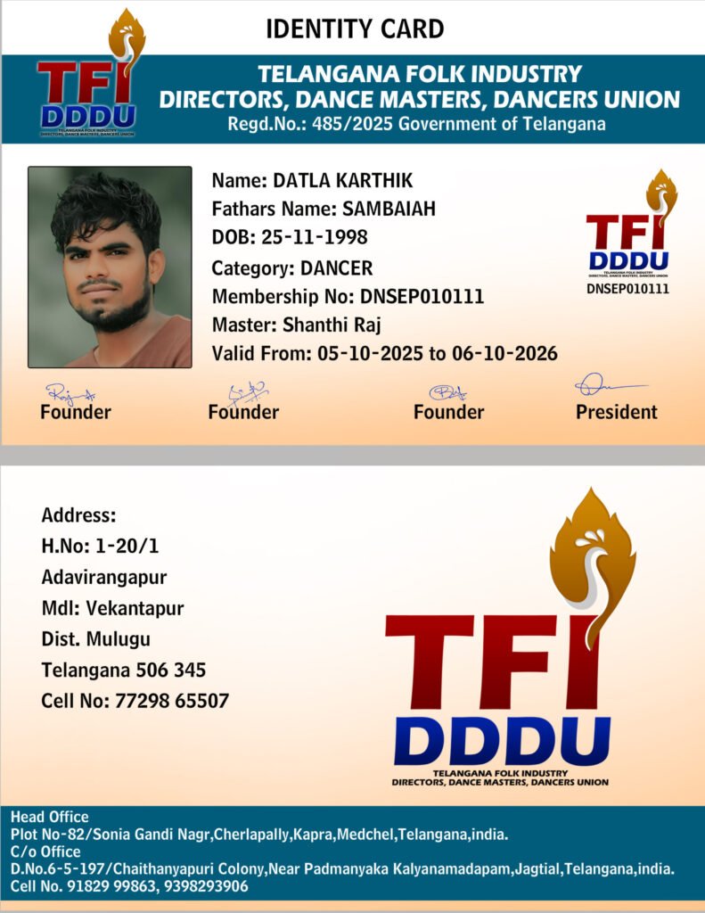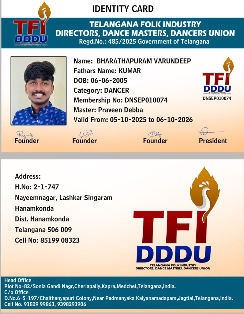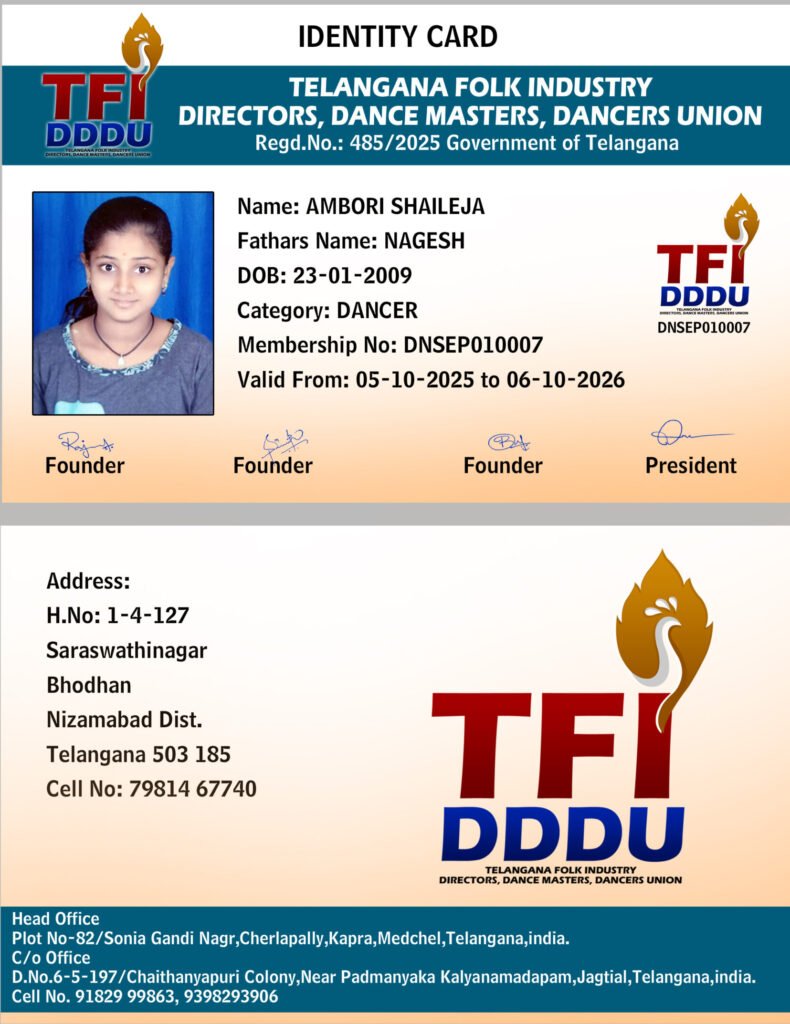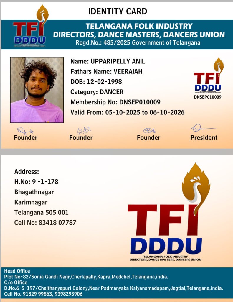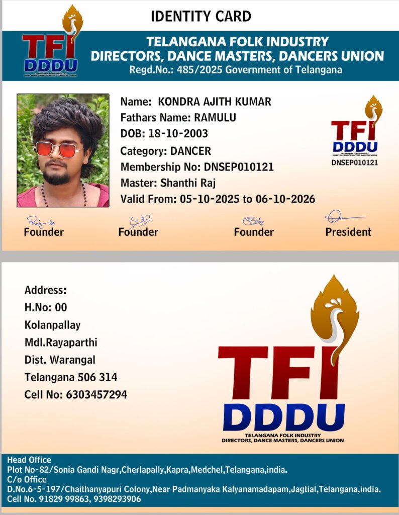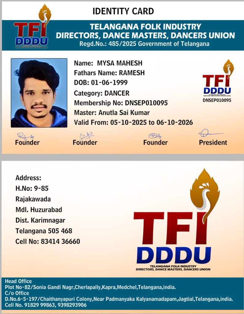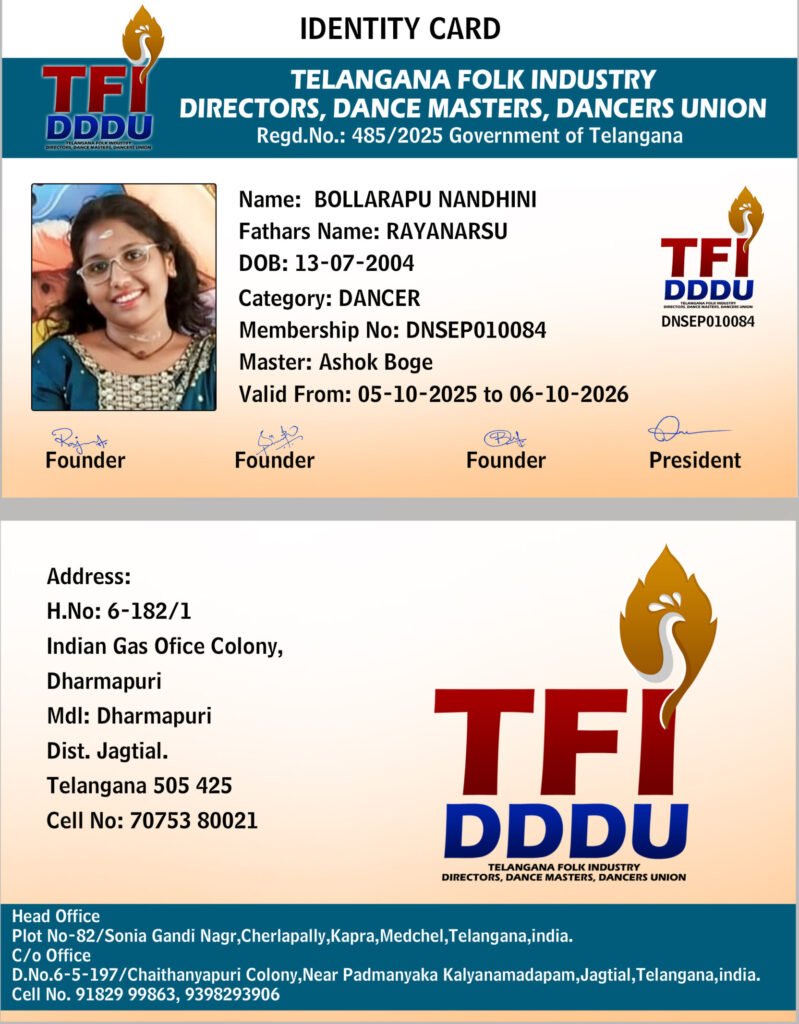 "Telangana Folk Industry Directors Dance masters Dancers Union" refers to an organization (union or association) that represents and supports professionals involved in the folk dance and film industry in the Indian state of Telangana.