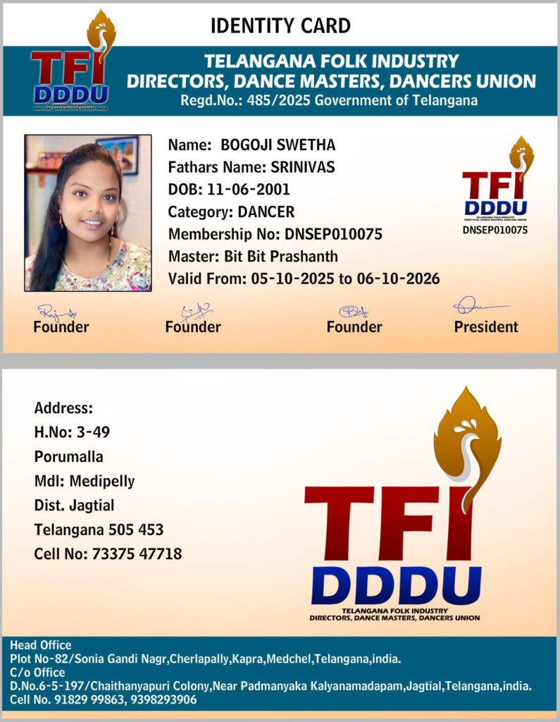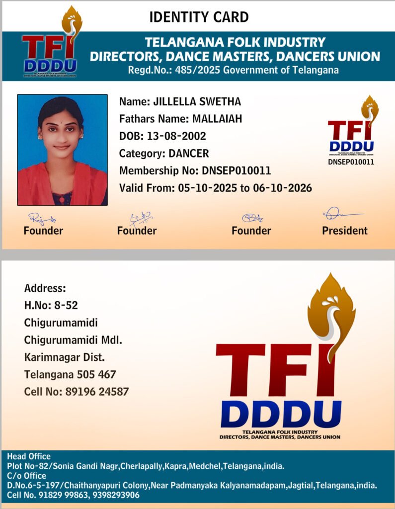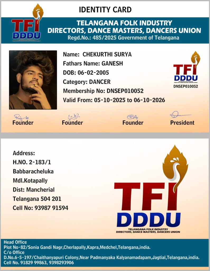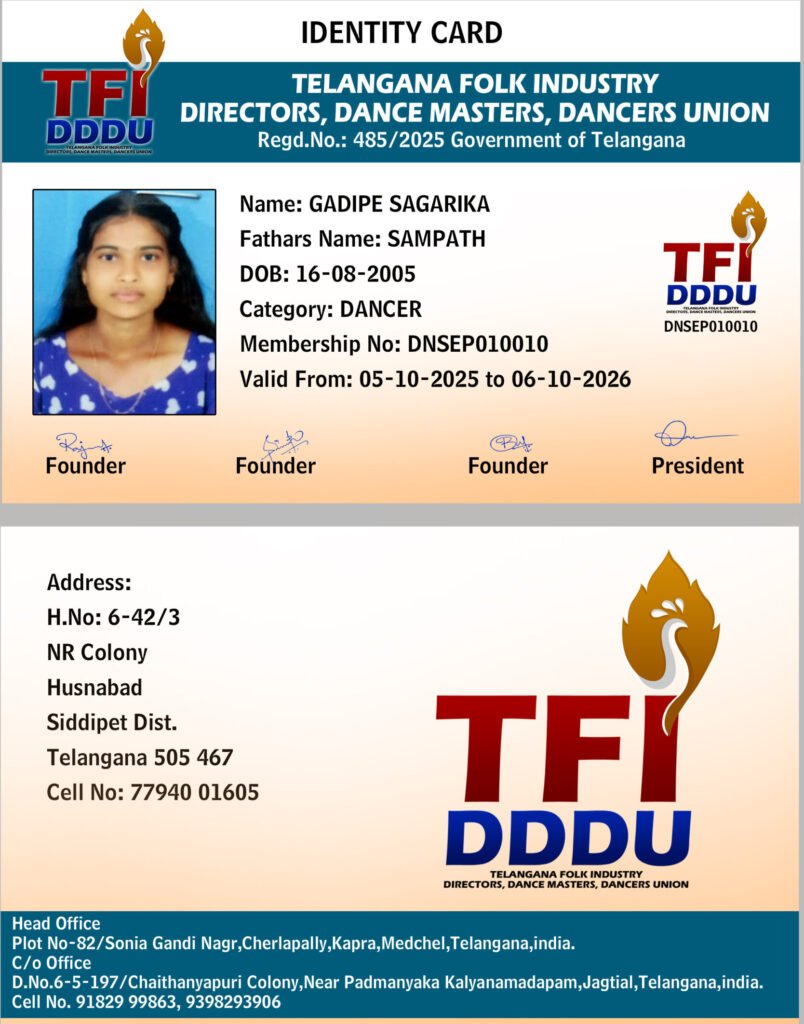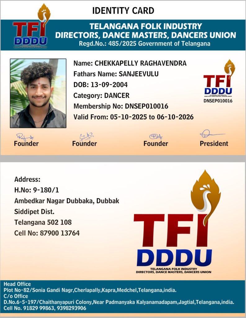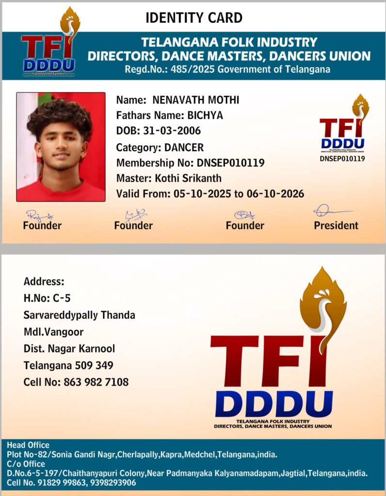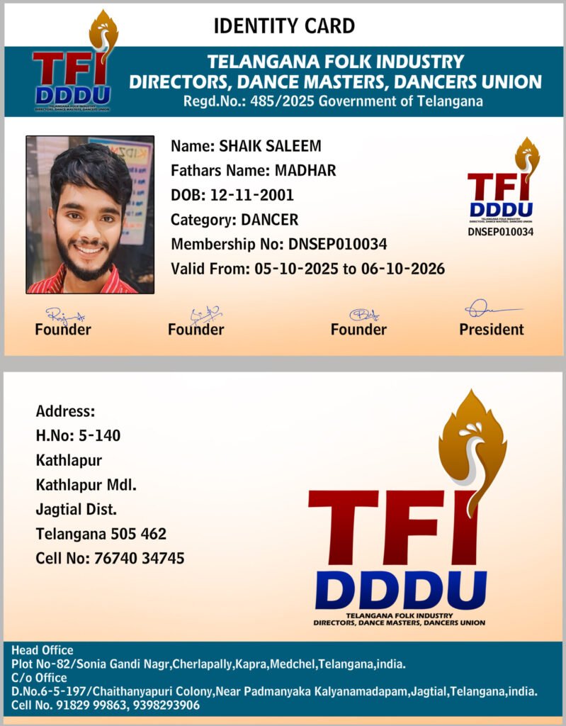 "Telangana Folk Industry Directors Dance masters Dancers Union" refers to an organization (union or association) that represents and supports professionals involved in the folk dance and film industry in the Indian state of Telangana.