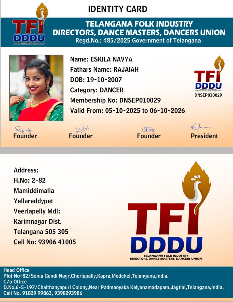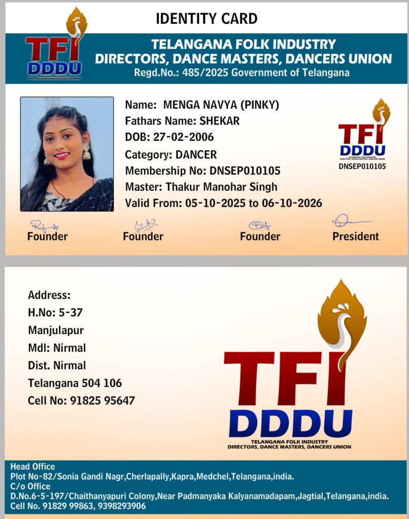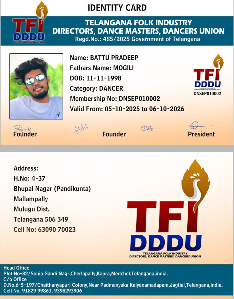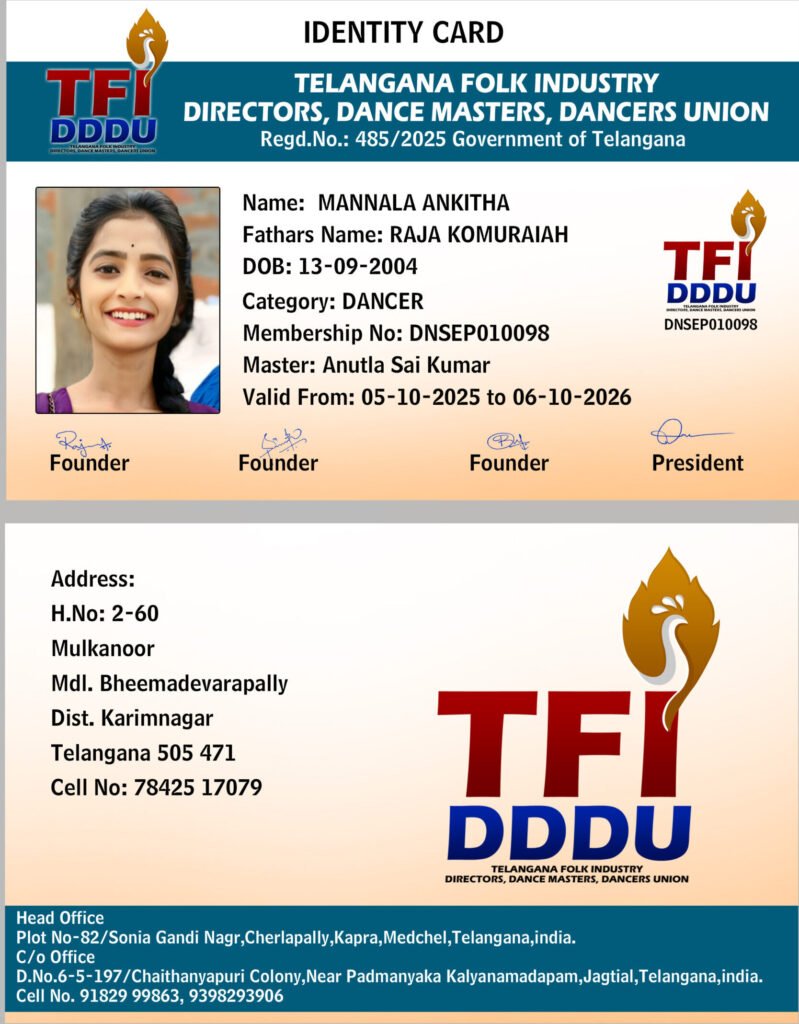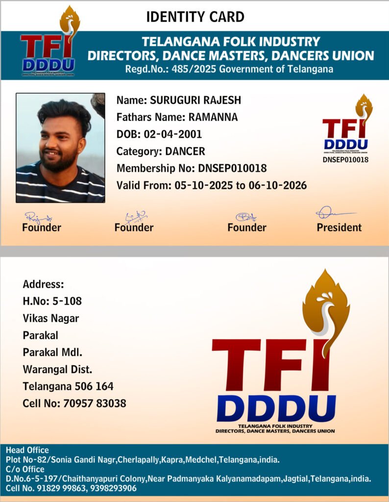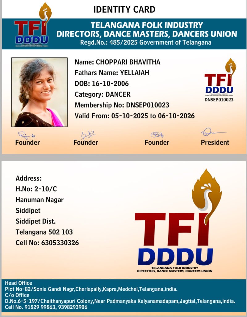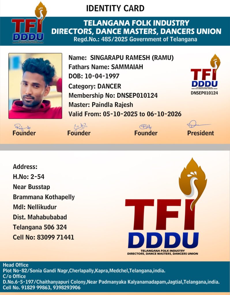 "Telangana Folk Industry Directors Dance masters Dancers Union" refers to an organization (union or association) that represents and supports professionals involved in the folk dance and film industry in the Indian state of Telangana.