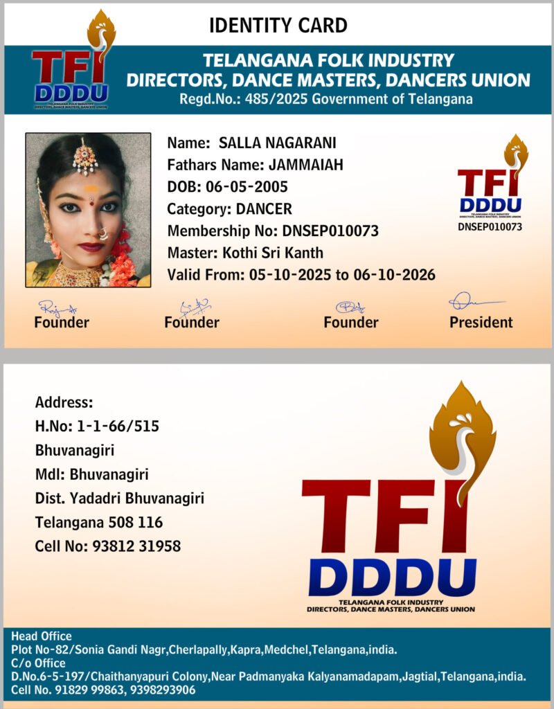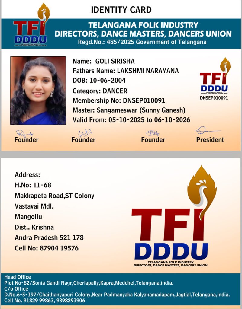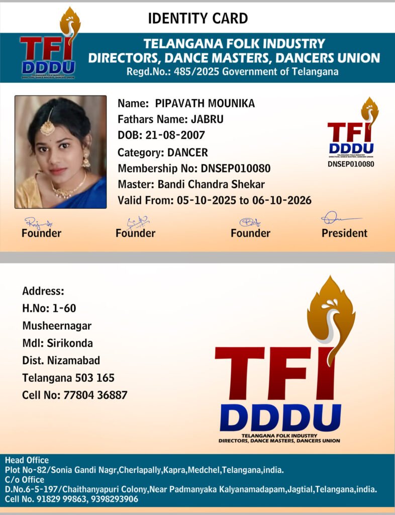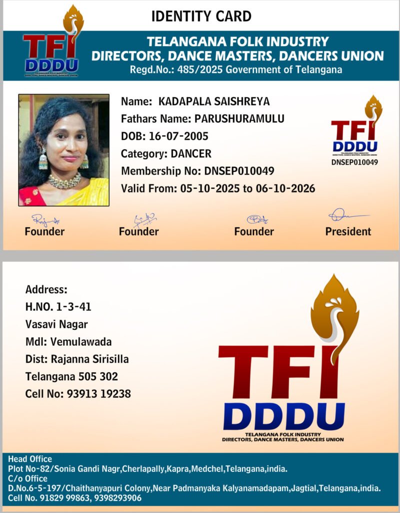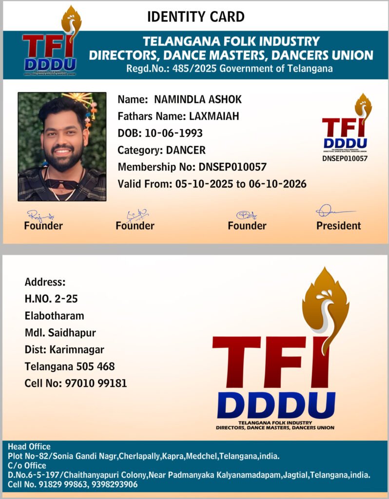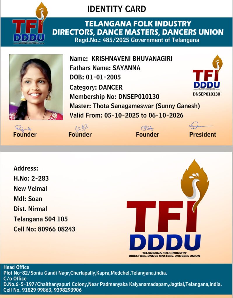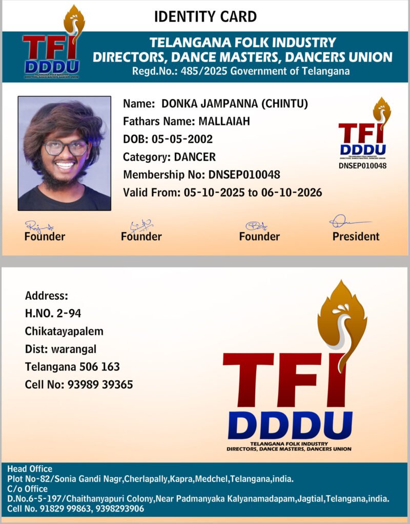 "Telangana Folk Industry Directors Dance masters Dancers Union" refers to an organization (union or association) that represents and supports professionals involved in the folk dance and film industry in the Indian state of Telangana.