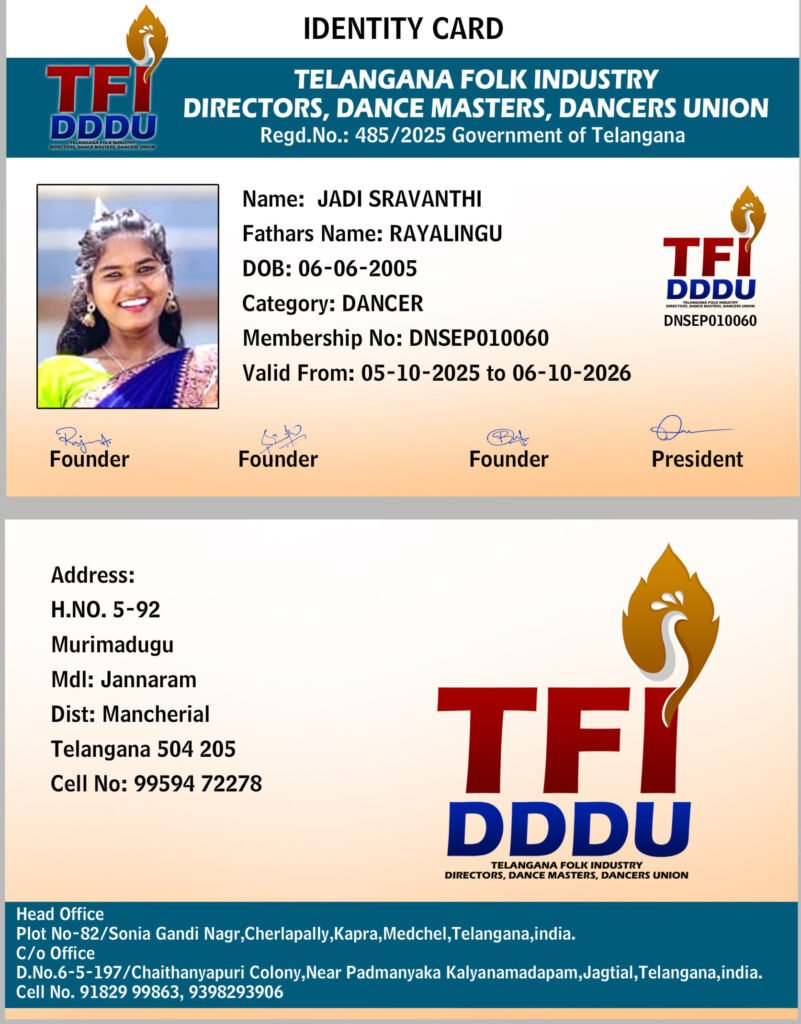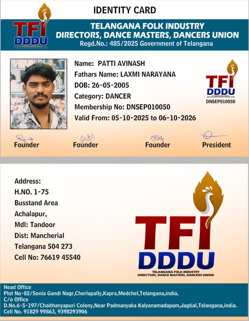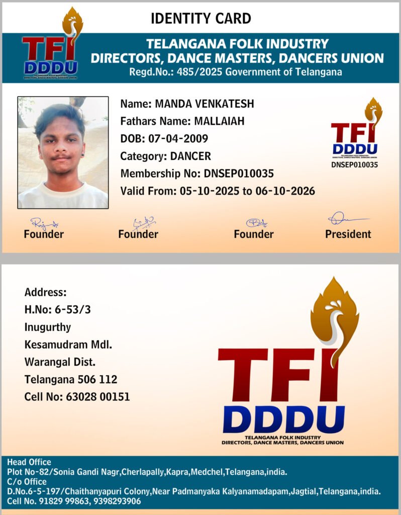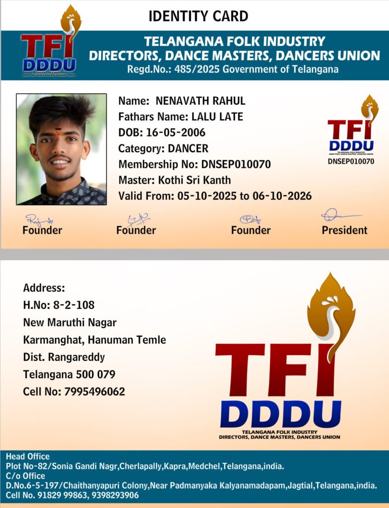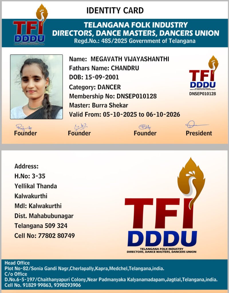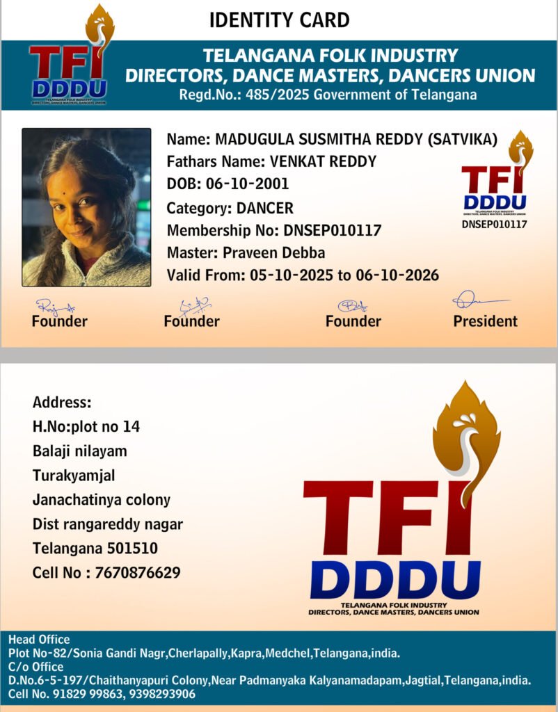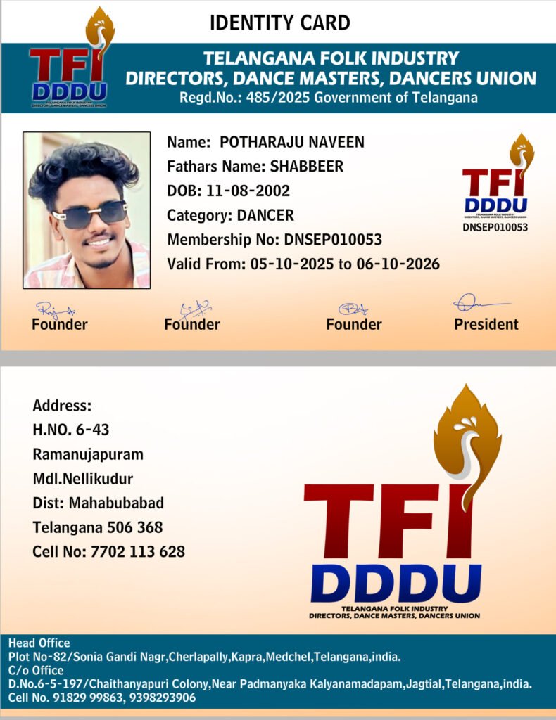 "Telangana Folk Industry Directors Dance masters Dancers Union" refers to an organization (union or association) that represents and supports professionals involved in the folk dance and film industry in the Indian state of Telangana.