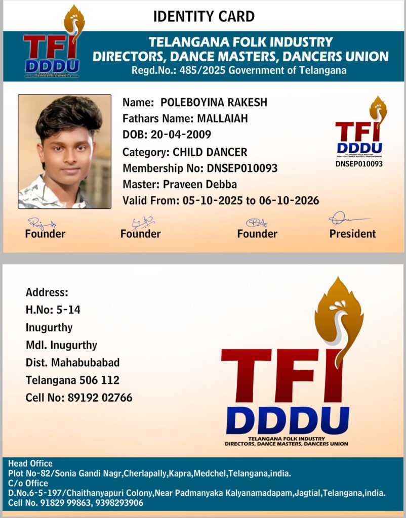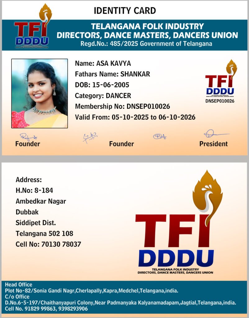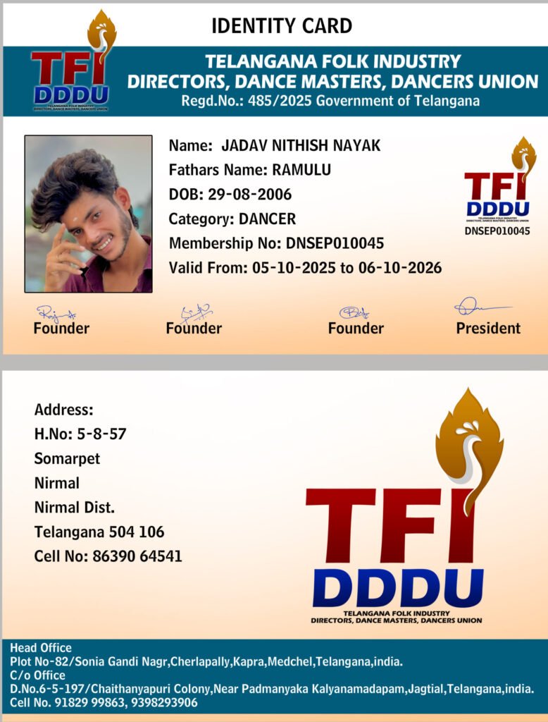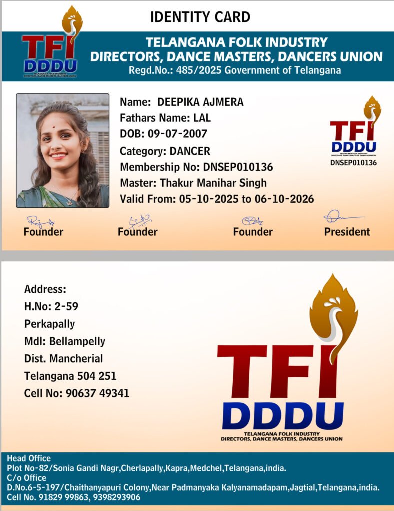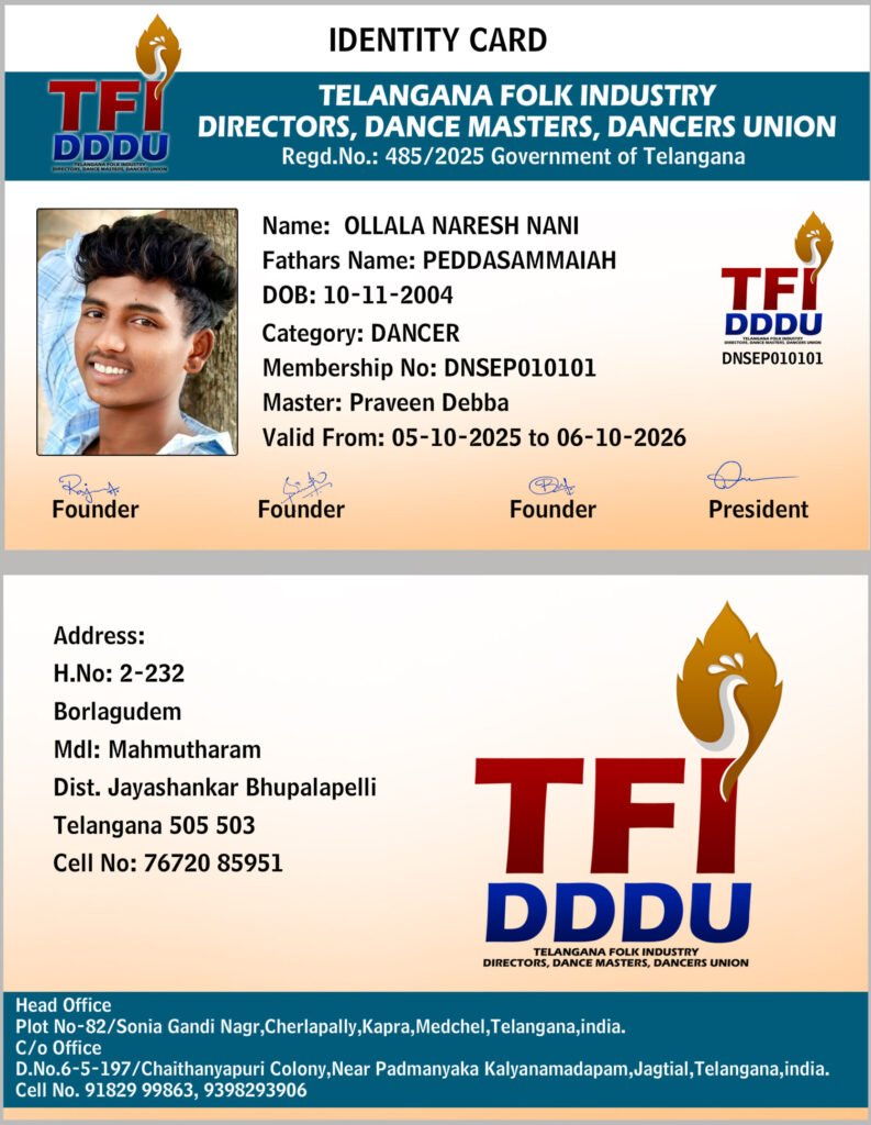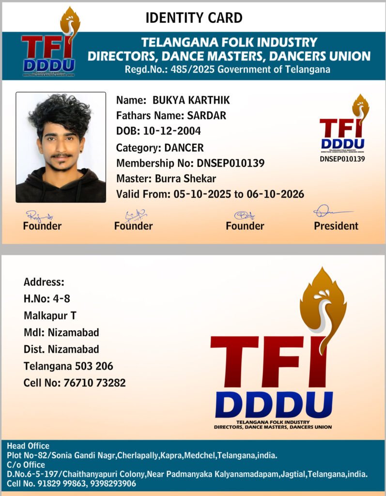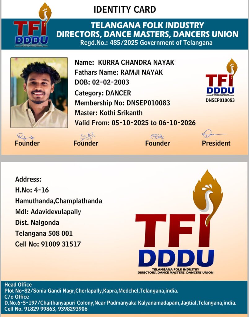 "Telangana Folk Industry Directors Dance masters Dancers Union" refers to an organization (union or association) that represents and supports professionals involved in the folk dance and film industry in the Indian state of Telangana.