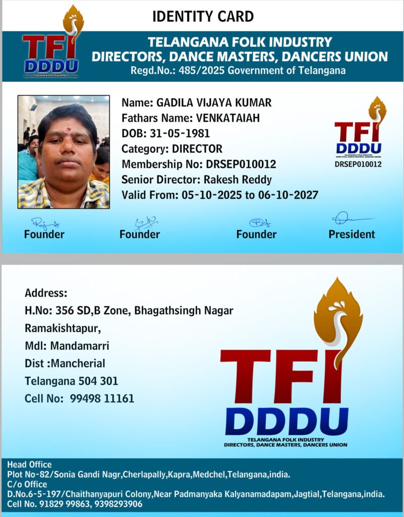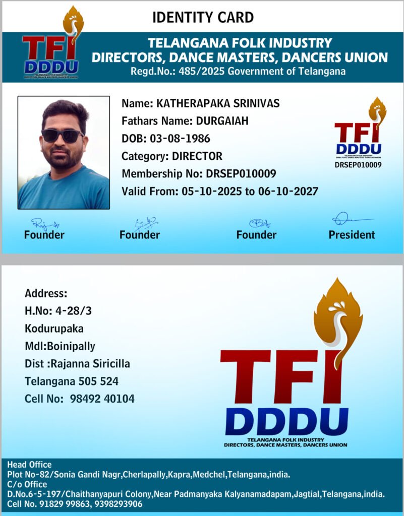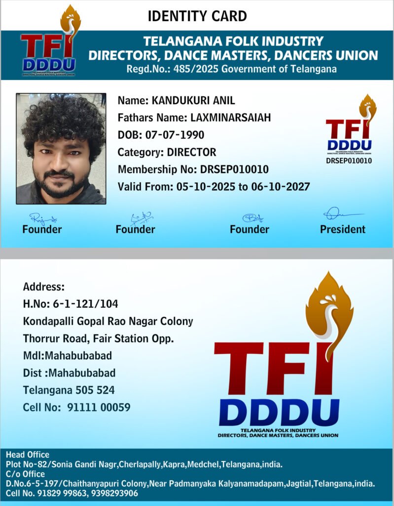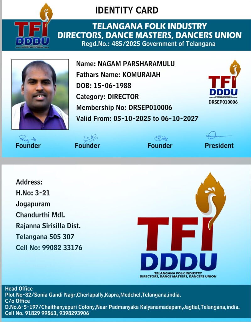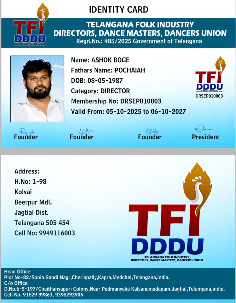 "Telangana Folk Industry Directors Dance masters Dancers Union" refers to an organization (union or association) that represents and supports professionals involved in the folk dance and film industry in the Indian state of Telangana.