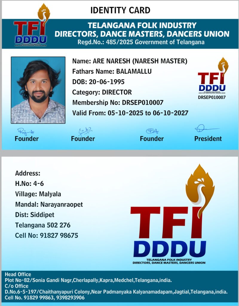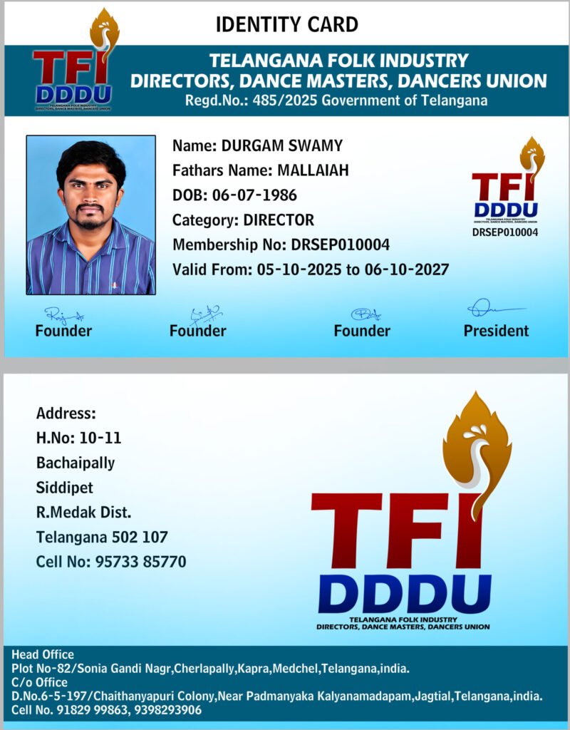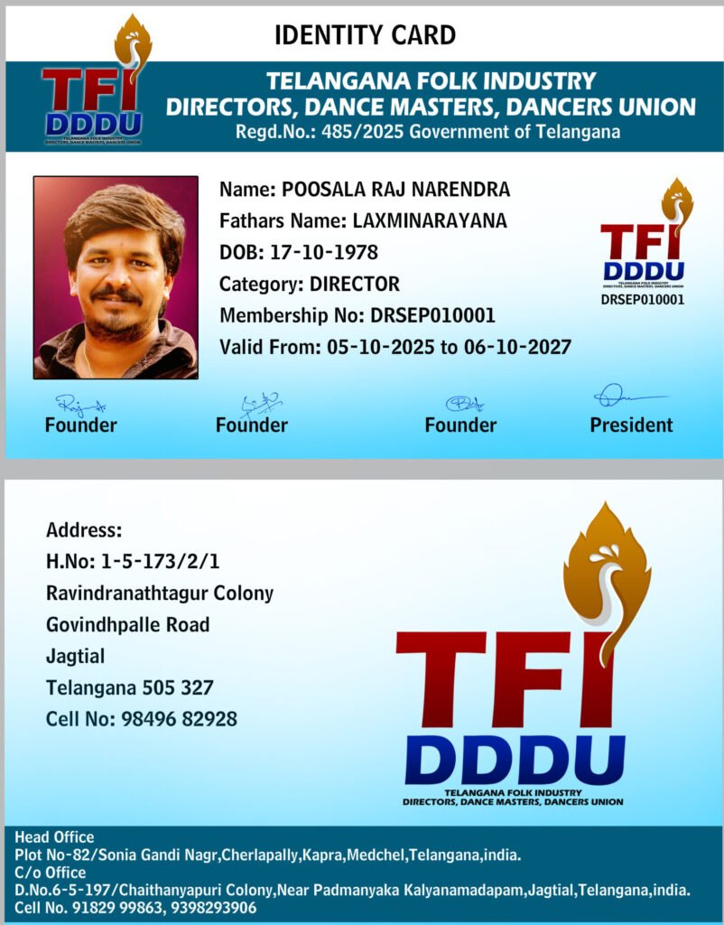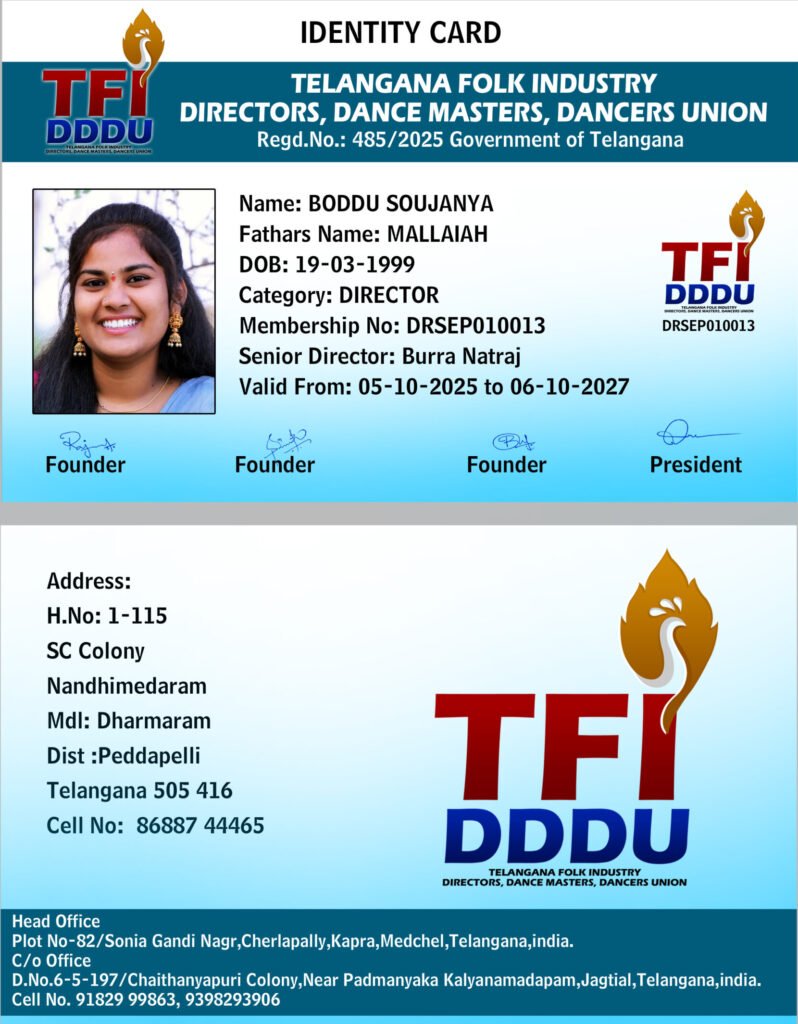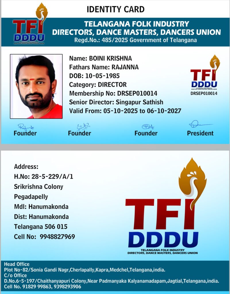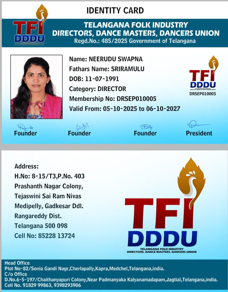 "Telangana Folk Industry Directors Dance masters Dancers Union" refers to an organization (union or association) that represents and supports professionals involved in the folk dance and film industry in the Indian state of Telangana.